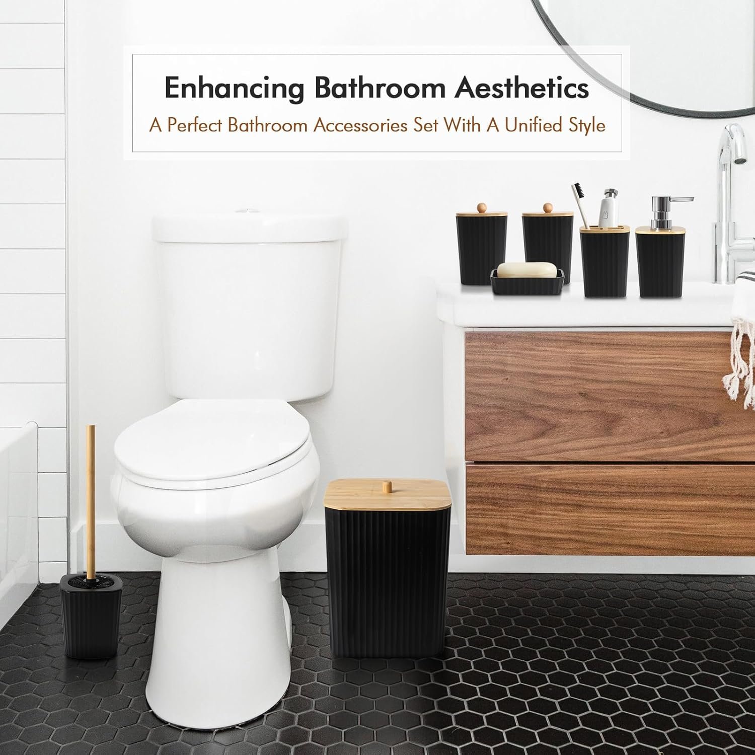 【ENHANCING THE BATHROOM EXPERIENCE】Keep unpleasant odors at bay with this waste bin with lid of the bathroom accessories set complete, designed to lock in smells effectively. Partnered with a sturdy-handled, firm-bristled toilet brush capable of thorough 360-degree cleaning, this duo significantly enhances your bathroom hygiene. Elevate your everyday living by maintaining a spotless and fresh environment effortlessly with this farmhouse black bathroom set.