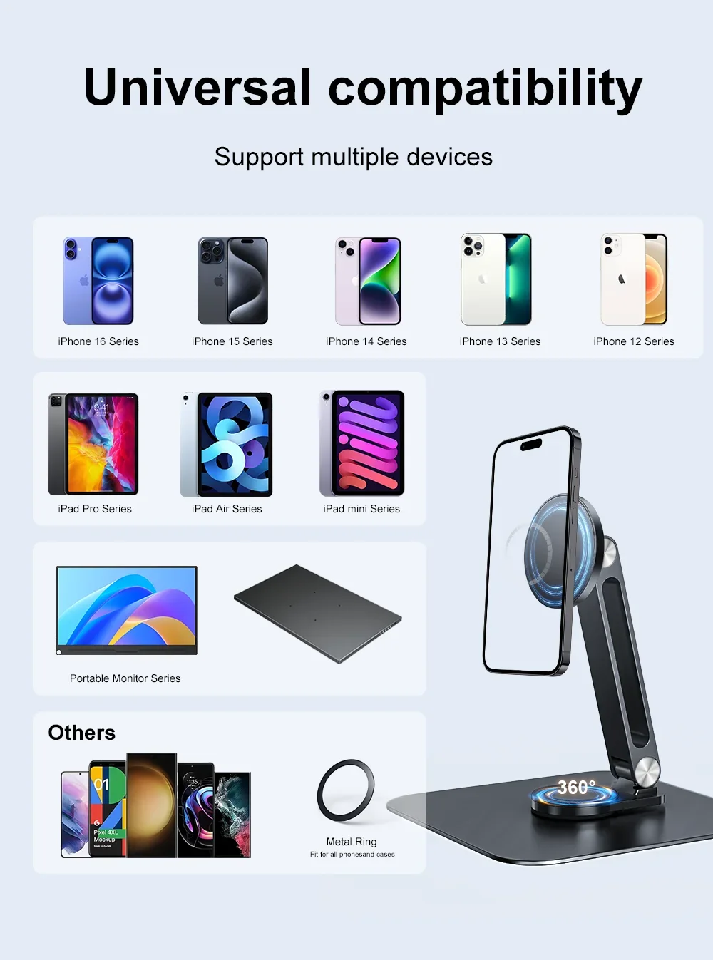 – Built-in powerful magnetic core for direct attachment to magnetic devices. Includes high-strength metal patches with 3M adhesive to easily adapt non-magnetic devices (e.g., plastic-back tablets/displays), expanding usability.