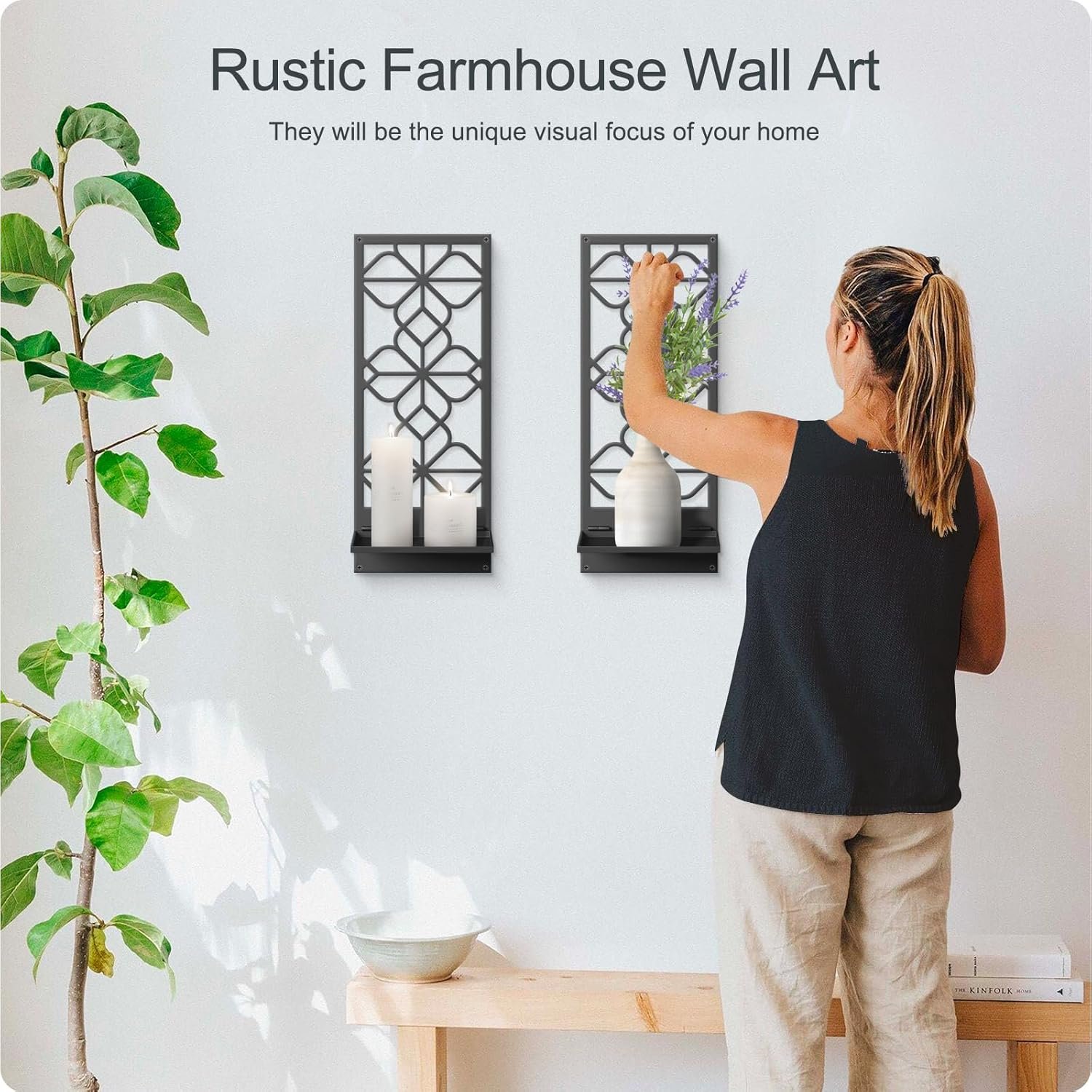 Unique Decor: Open your artistic talents to match multiple rustic ornaments with these black metal wall candle holder . with candles, jars, vases, small plants, or other decorative pieces standing on the sconces, they would be unique rustic wall decors for your home.