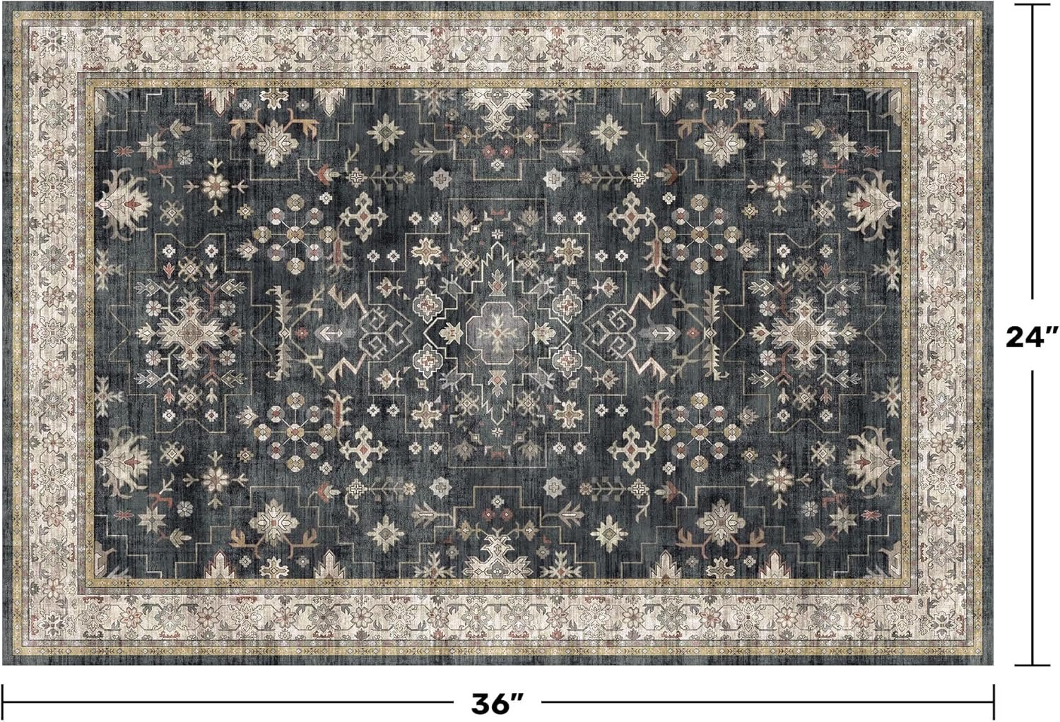 Black Washable 2×3 Entry Rug, Small Rugs for Entryway Kitchen Bathroom Door Mat Indoor Entrance, Non Slip Rubber Backing, Stain & Fade Resistant, Ashen Charcoal Floral Farmhouse Decor
