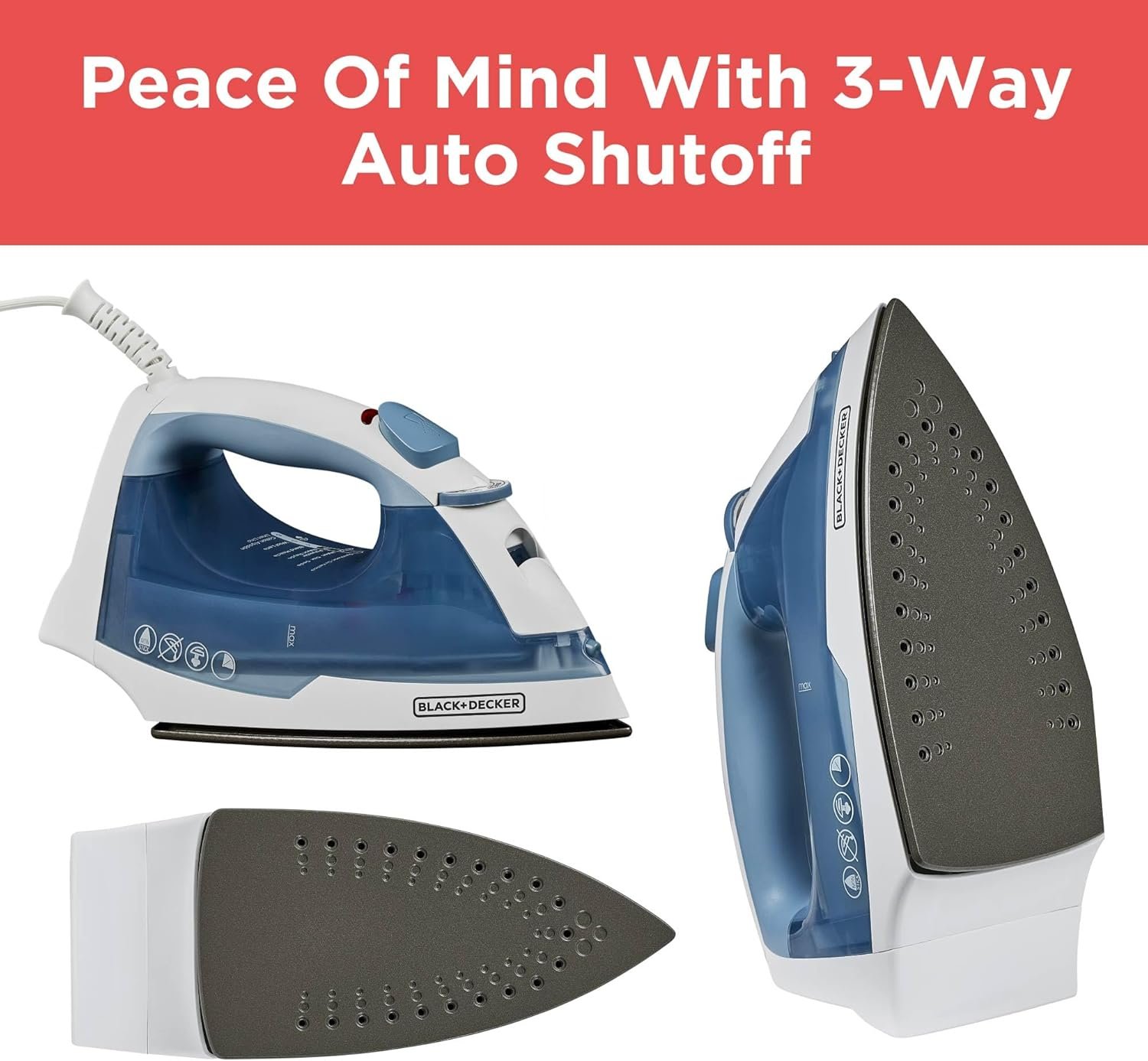 3-WAY AUTO SHUTOFF: Get peace of mind with motion-sensitive technology that automatically shuts off the iron if left inactive on its heel, side or soleplate. To clean iron, wipe soleplate and outer surfaces with a soft cloth dampened with water.