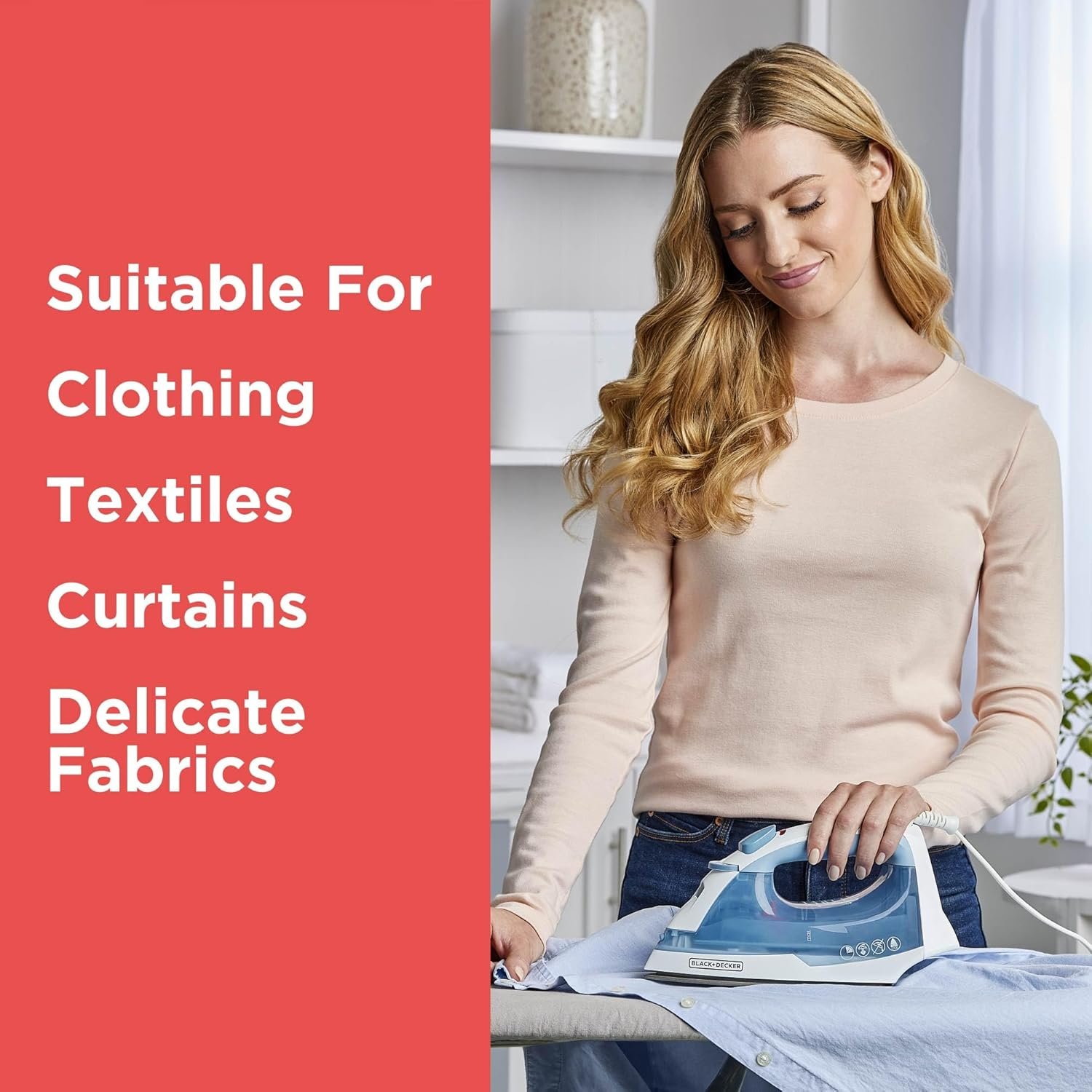TRUEGLIDE NONSTICK SOLEPLATE: The enhanced soleplate is designed to glide smoothly across all fabric types for ease of use. Recommended for fabrics such as Cotton/Wool/Blend/Polyester/Rayon/Nylon/Synthetic.