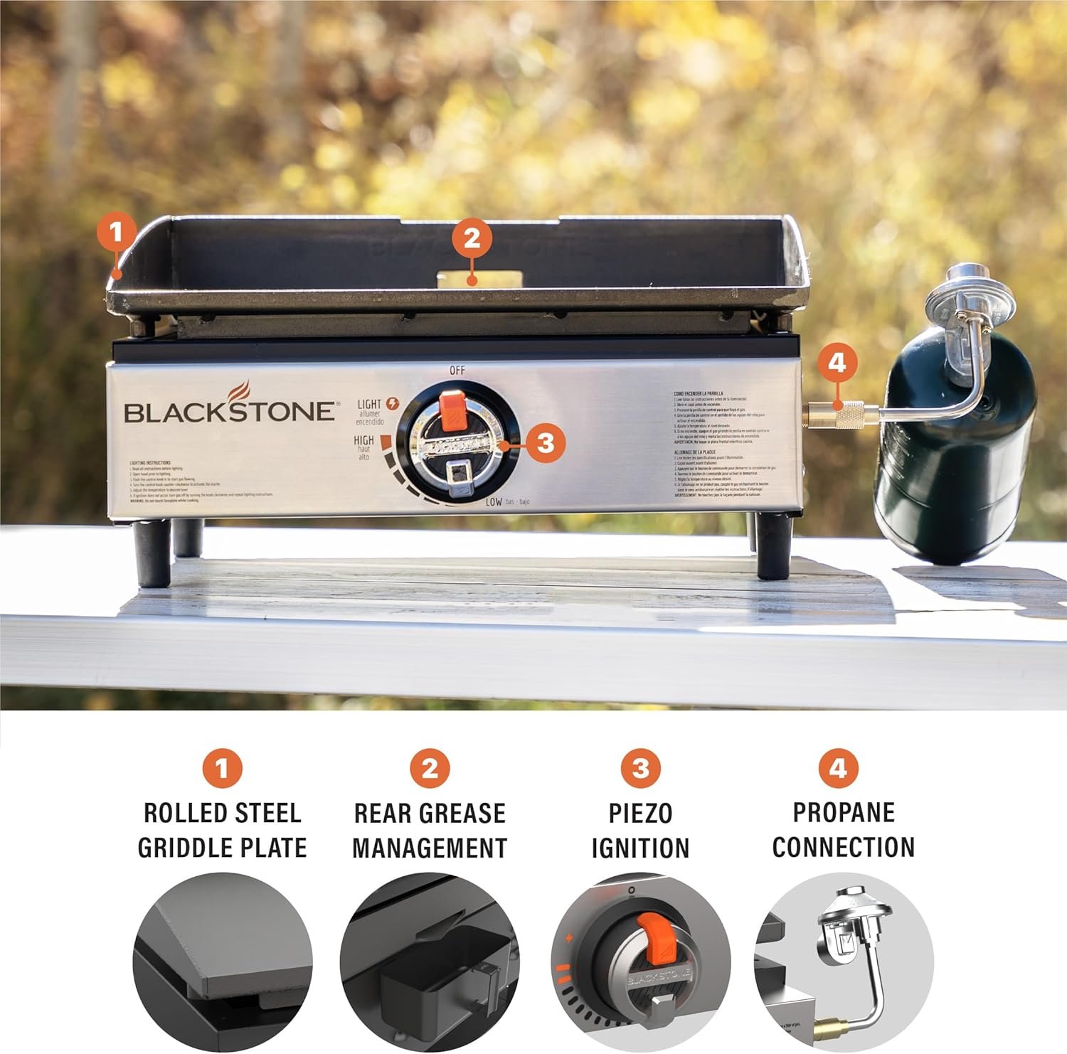 Griddle on the Go: Bring this Blackstone 17-inch tabletop griddle on your next camping, hunting, or tailgating adventure to make great meals on the go. This griddle is the perfect portable cooking station with its lightweight, carry-friendly design.