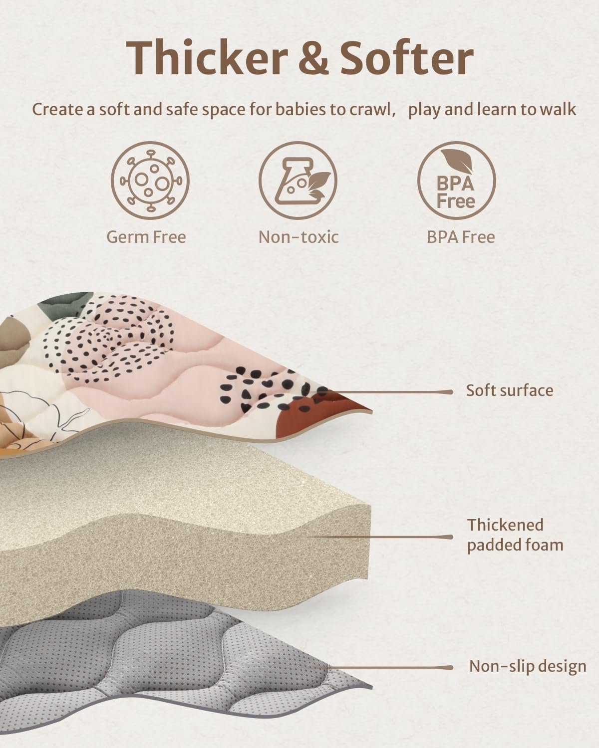 Thicker & Soft Premium Foam – Our baby play mats for floor is thicker than most other brand baby play mat. And it’s made of premium soft padding foam and fabric top layer to ensure a soft and cushioned surface, providing a comfortable place for your little one to relax, play and work on their developing skills