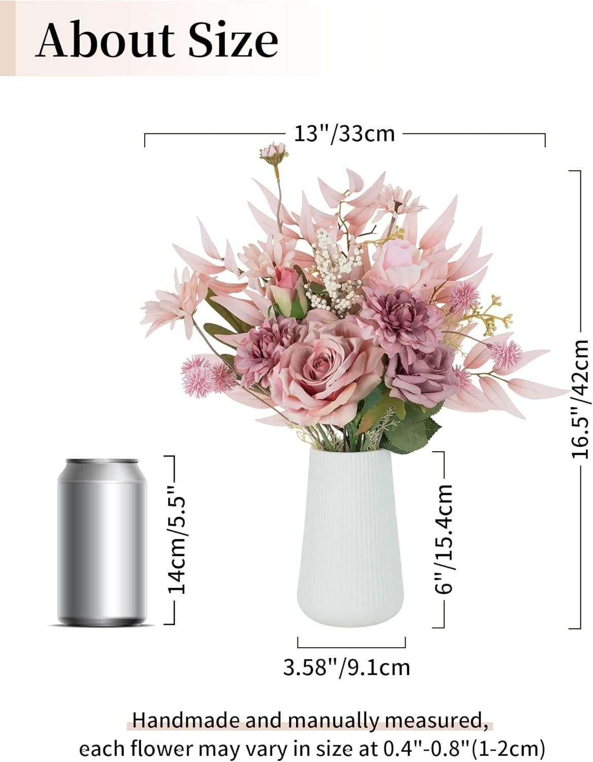 Size: Measured at 16.5 inches in height and 13 inches in width, this elegant faux flowers in vase is perfect for sprucing up any room in your home. With each vase measured at 6-inch height and 3.58-inch diameter, it’s easy to find the perfect spot to display this gorgeous artificial flowers in vase