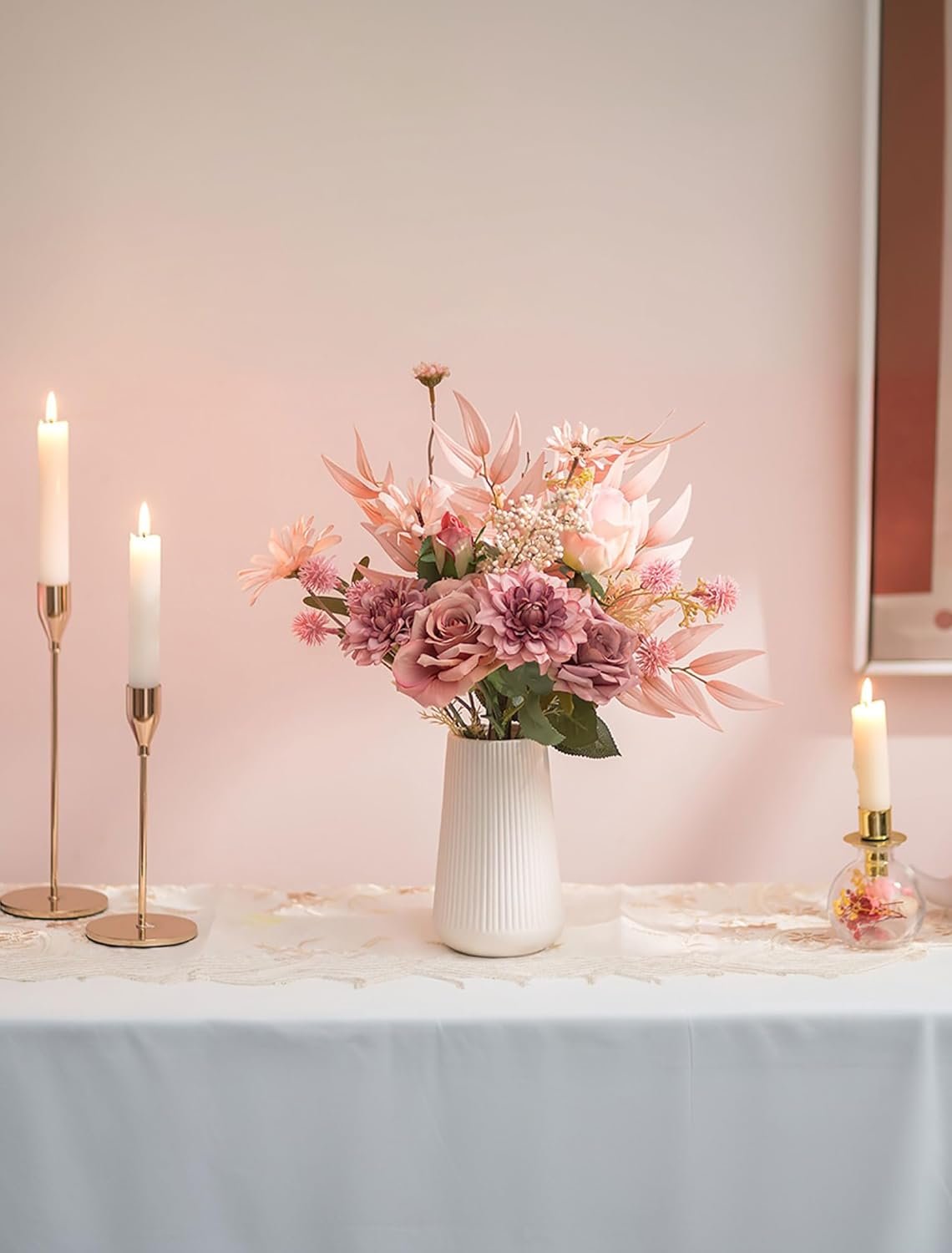 BLOSMON Flower Centerpieces for Tables in Vase: Dusty Pink Artificial Flowers in Ceramic Vase Home Decor – Fake Roses Faux Dahlias Bouquet Kitchen Dining Room Wedding Decoration