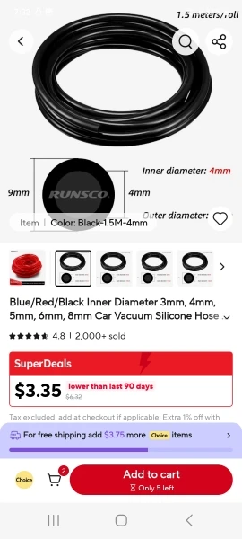 This silicone vacuum hose is a fantastic value for the quality you get. I used it for a custom gy6 scooter setup, and the 4mm inner diameter fit snugly with no clamps needed for most connections. The silicone is thick, flexible, and heat-resistant, which makes it perfect for vacuum lines, breather hoses, or even fuel overflow routing. It holds up well under engine bay temps and doesn’t collapse under suction. The black color looks clean and professional in my engine compartment. For the price, you really can’t beat it—especially at 1.5 meters per roll. I’ll definitely be ordering more in other sizes for future builds. Highly recommended for diy tuners and custom scooter or car projects.