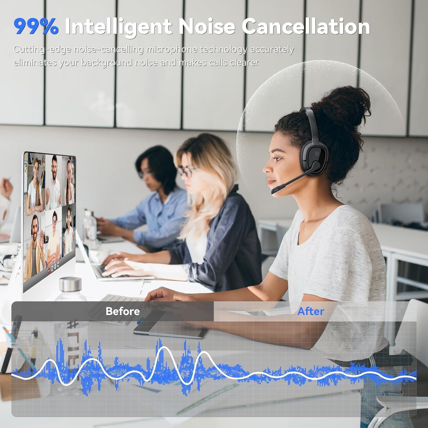 The bluetooth headset filters out 99% of your background noise with microphone AI noise-cancelling technology. Even if you’re in a busy office, you don’t have to worry about the sound of keyboard typing or colleagues chatting affecting your calls with clients