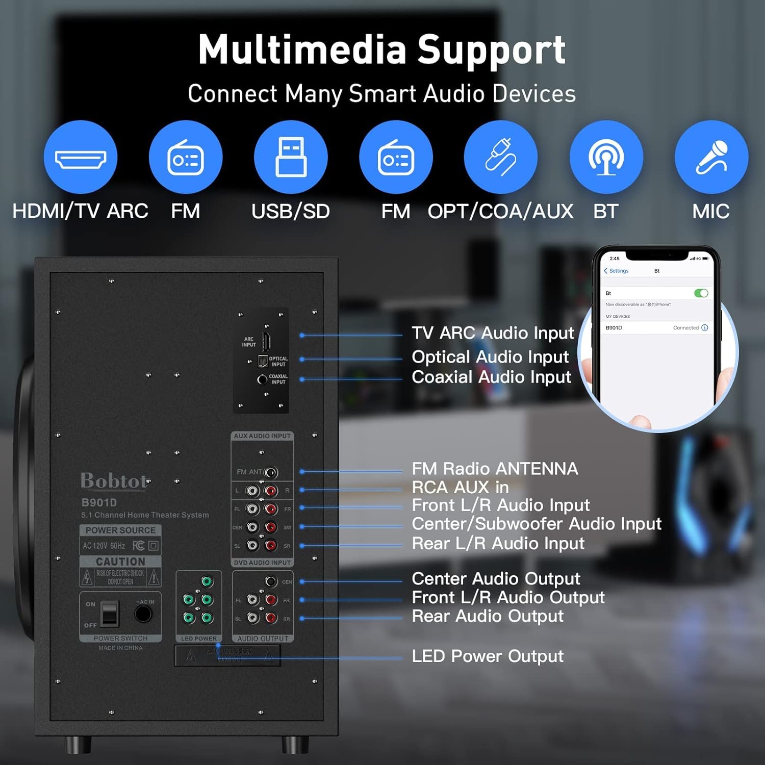 Bluetooth & Multimedia Support – The surround sound speakers support various smart devices. Bluetooth 5.0 technology supports you to connect with Bluetooth devices directly. It’s also compatible with HDMI/OPT/COA/AUX/USB/DVD audio sound inputs. Additional cables include HDMI ARC Cable/Optical cable/Coaxial cable/AUX cable/RCA cable/Antenna cable supports any application in need