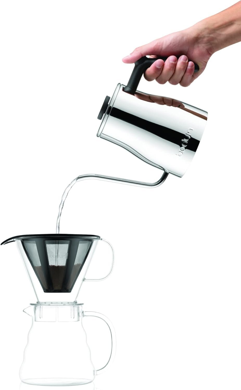 Hot water is distributed slowly and evenly over the coffee dripper, allowing for a rich taste and robust aroma to develop.