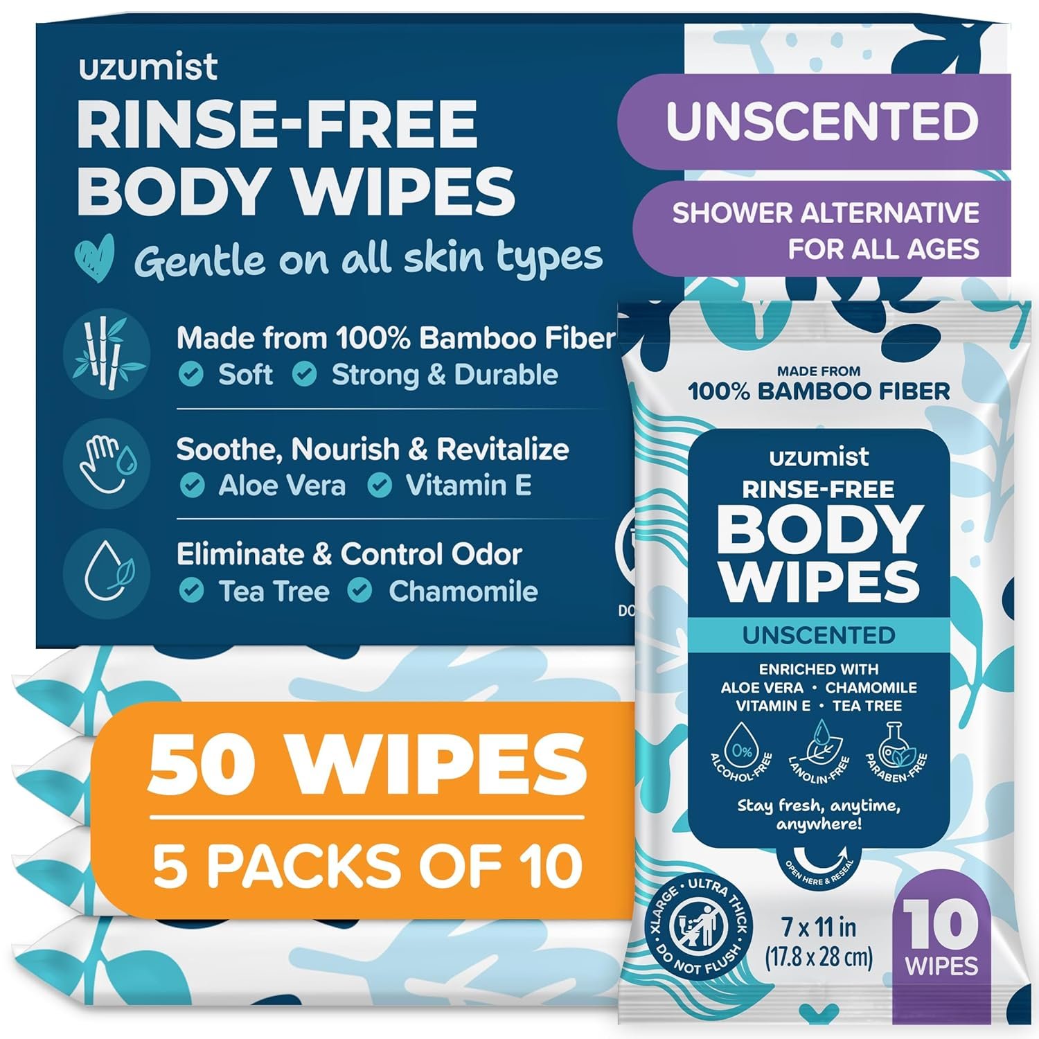 Effectively Clean The Body And Eliminate Dirt, Odors, Sweat & Grime. 5 Packs of 10 XL Shower Wipes – 50 wipes total – ready to use with no soap or water needed! Medical-grade bath wipes for adults incorporate tea tree oil and chamomile to cleanse & neutralize unpleasant odors caused by sweat, prolonged periods without bathing or incontinence. Deliberately constructed to leave no gross, sticky after-feel. Carry disposable washcloth cleansing wipes to feel clean no matter the circumstance.