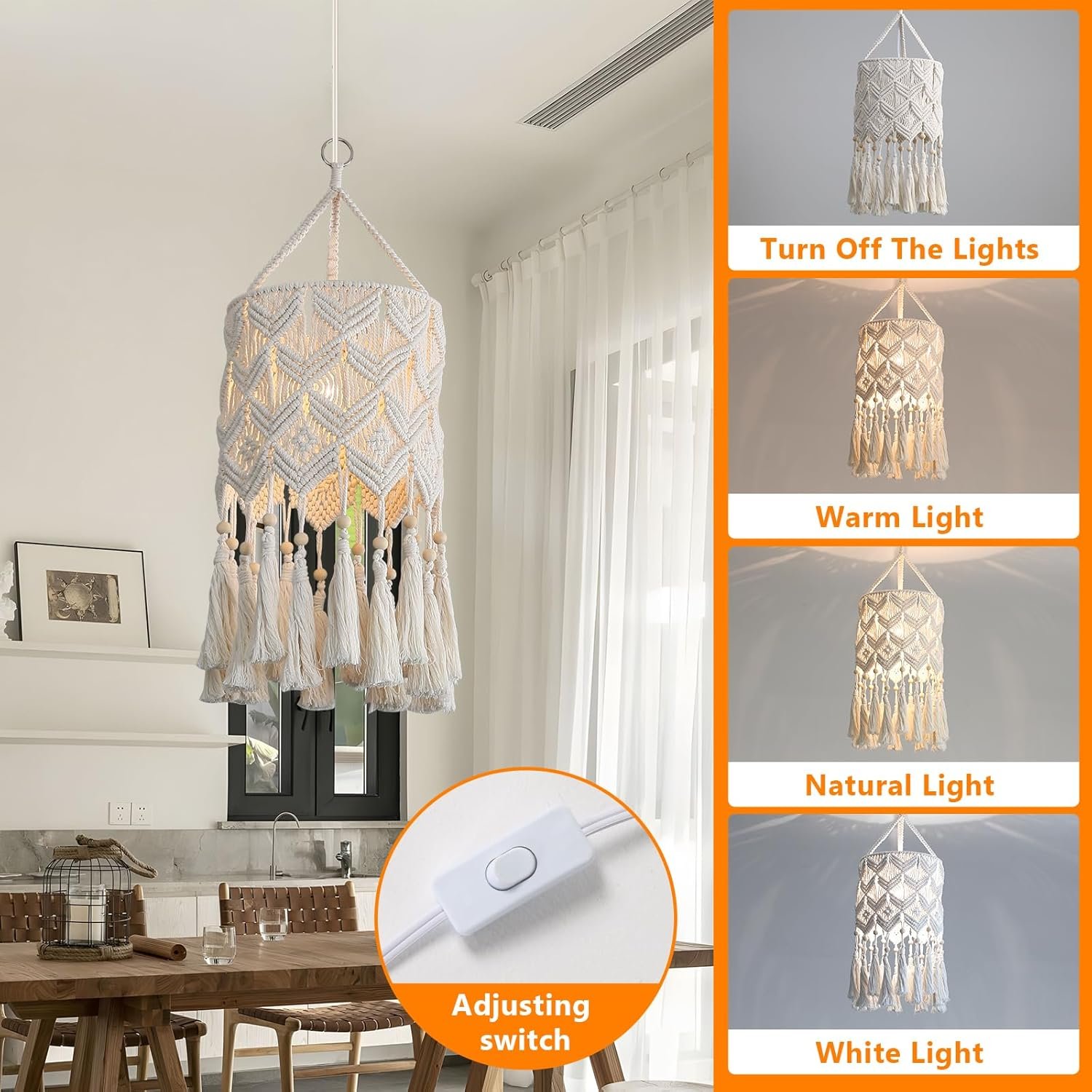 【Unique Design Hanging Lights 】This gorgeous macrame pendant lights is handmade with natural cotton rope and by unique pattern, fresh design is an elegant update for traditional and modern homes alike,is a perfect boho hanging lamp for any space.