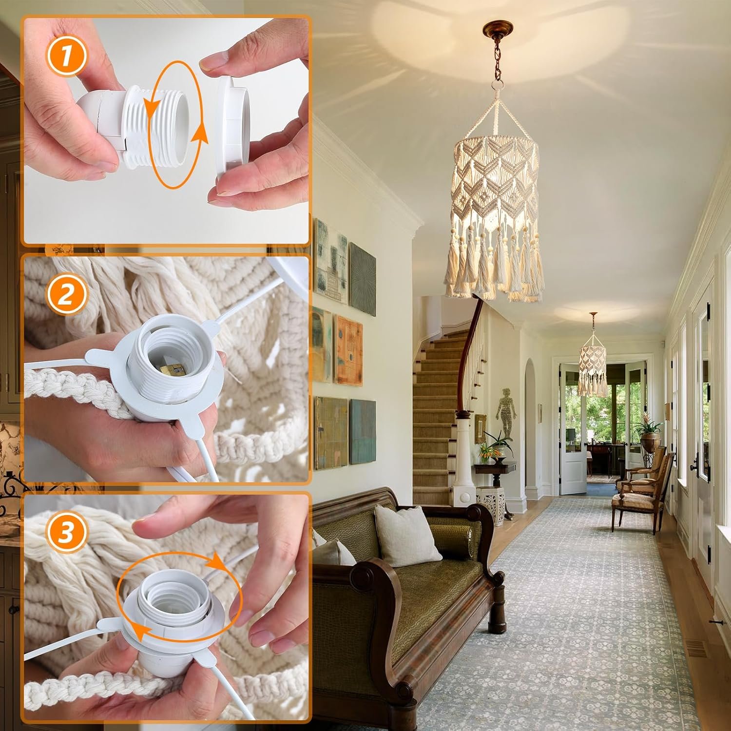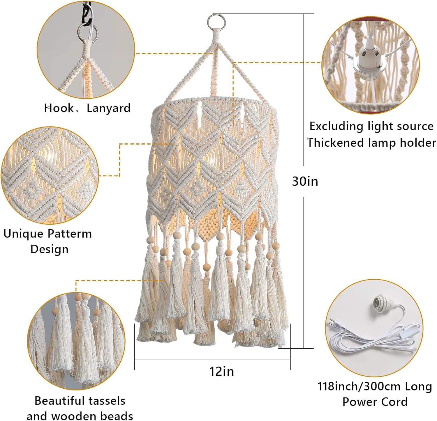 【Dimension and Bulb Requirement】The boho light fixture largest ring diameter is 12.2 inches, the height from the top to longest tassel is 25.59 inches, Cord length is 118 inches (Adjustable). Compatible with a variety of Incandescent,saving energy lamp, LED, Edison blub. (Bulbs not included)