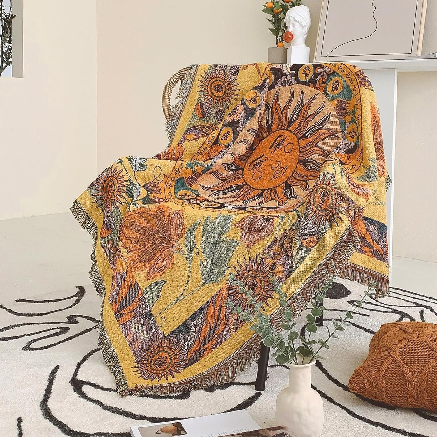 Boho Throw Blanket Reversible Cotton Bohemian Tapestry Hippie Room Decor Outdoor Blanket Double Sided (National Sun Pattern Yellow 50″x60″)