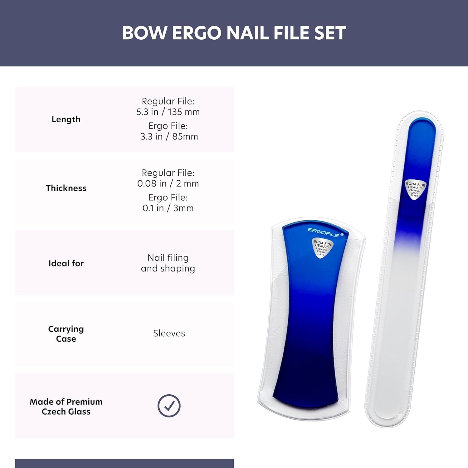 BONA Fide Beauty Glass Nail File Manicure Set, 2-Pieces Blue Ergonomic Comfort Grip Bow Ergofile for Gentle & Efficient Filing, Nail Care Tools Genuine Czech Glass
