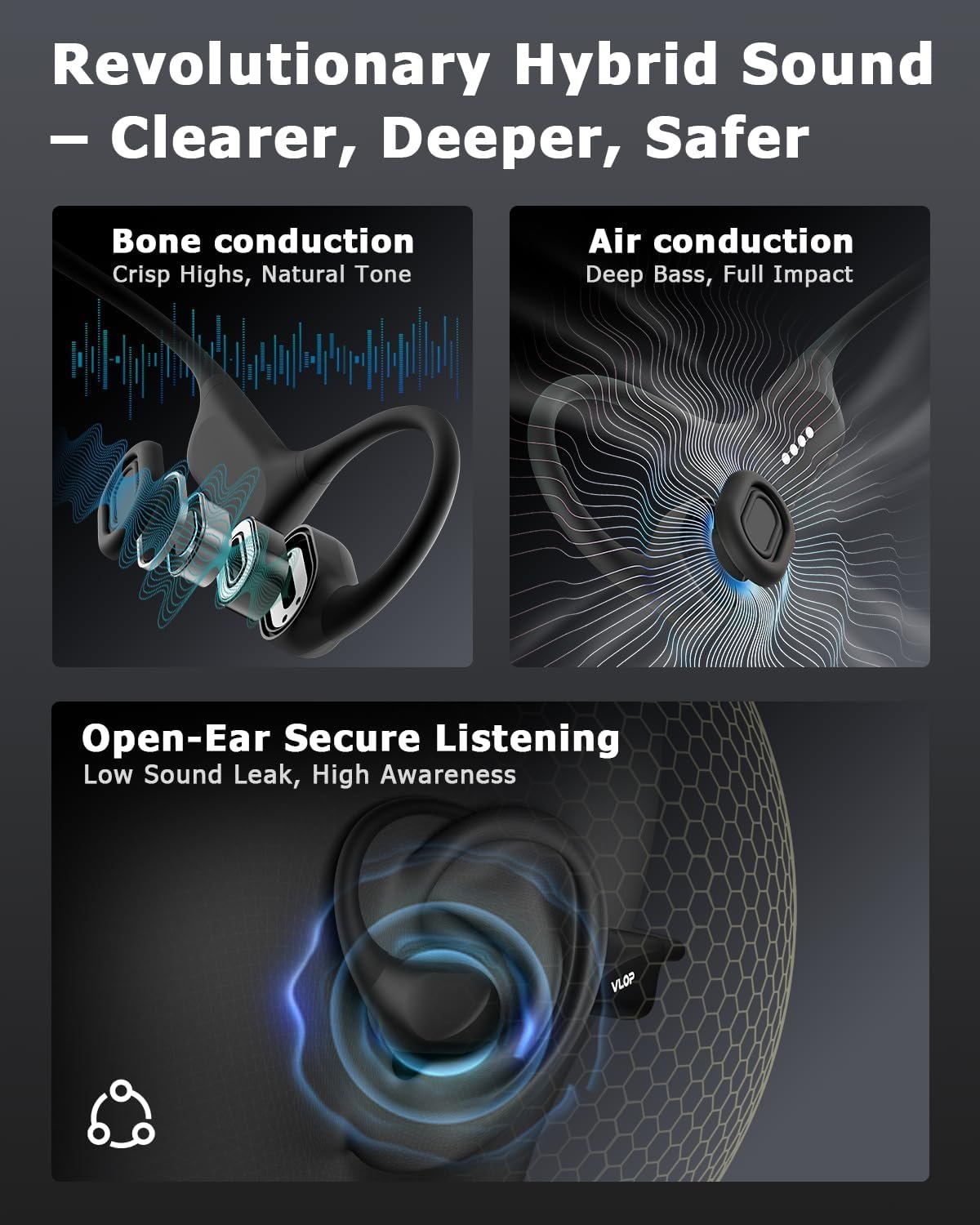 【Hybrid Bone + Air Conduction Technology】Next-generation hybrid dual-driver design combines bone conduction clarity with rich air conduction bass. Enjoy open-ear safety and high-quality sound comparable to traditional headphones, perfect for outdoor sports and workouts.