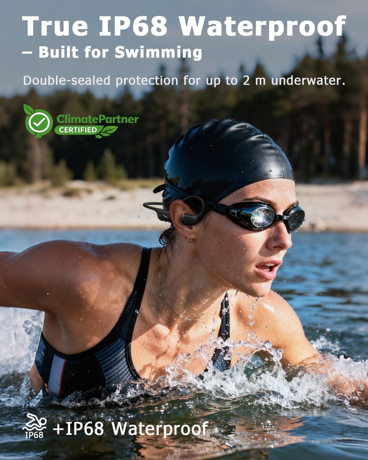 【IP68 Waterproof for Swimming Use】Triple-sealed waterproof structure resists sweat, rain, and full water immersion up to 2 meters for 2 hours. Supports MP3 playback underwater—ideal for swimming, surfing, or triathlon training. (Bluetooth mode is not available underwater.)