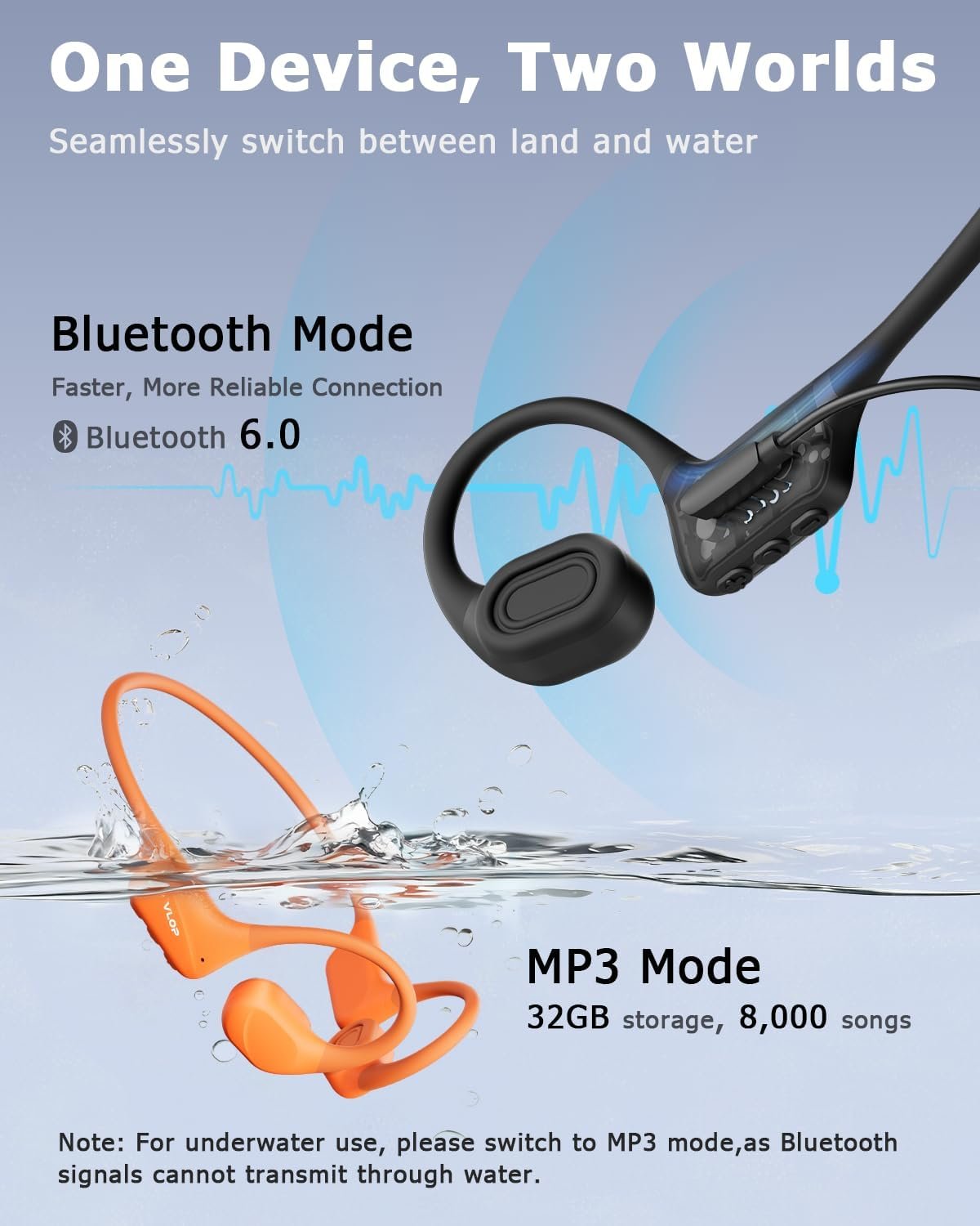 【Dual Mode: Bluetooth 6.0 & MP3 Player】Switch freely between Bluetooth 6.0 streaming and standalone MP3 mode. Store up to 8000 songs for phone-free listening while swimming or traveling. Low-latency wireless connection ensures smooth audio during running or cycling.