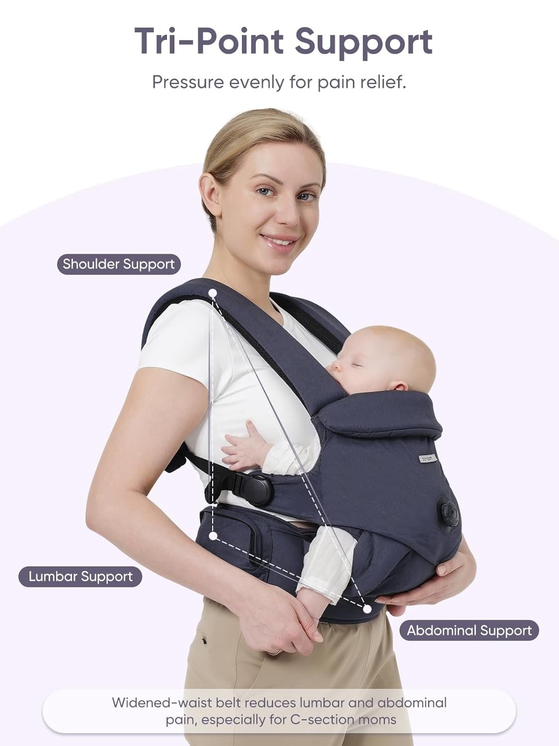 【Ergonomic Tri-Point Support 】bonoch toddler carrier features a full-length EVA waist belt, the widened design reduces abdominal pressure and provides exceptional lumbar support, evenly distributes weight across the shoulder and lumbar, ensures tri-point ergonomic support, relieves pain, especially for mothers recovering from a C-section, and offers maximum comfort for long-time wear. Thickened H-shape shoulder strap to reduce shoulder and neck pressure and pain.