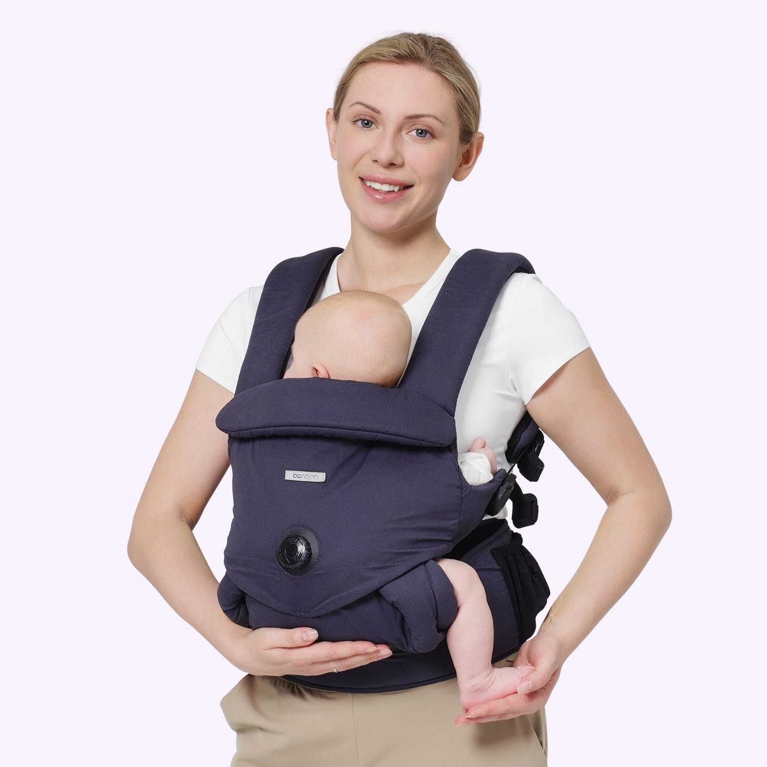 bonoch Baby Carrier Newborn to Toddler – EaseFit Adjust Knob for Baby Hip Healthy Develop, Ergonomic Cotton Infant Carrier, Dual Lock Belt, Storage Bottle Pocket, 3 Bibs, 7-40lbs, Shower Gifts