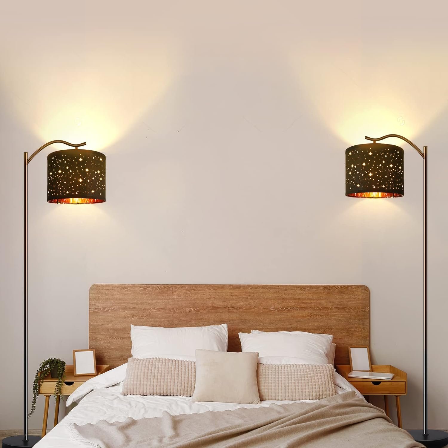 BoostArea Floor Lamp for Living Room,LED Arched Tall Modern Standing Lamp with Bohemian Linen Shade, E26 Socket, Footswitch,Black Mid Century Floor Lamp for Bedrooms,Office,Star Shade