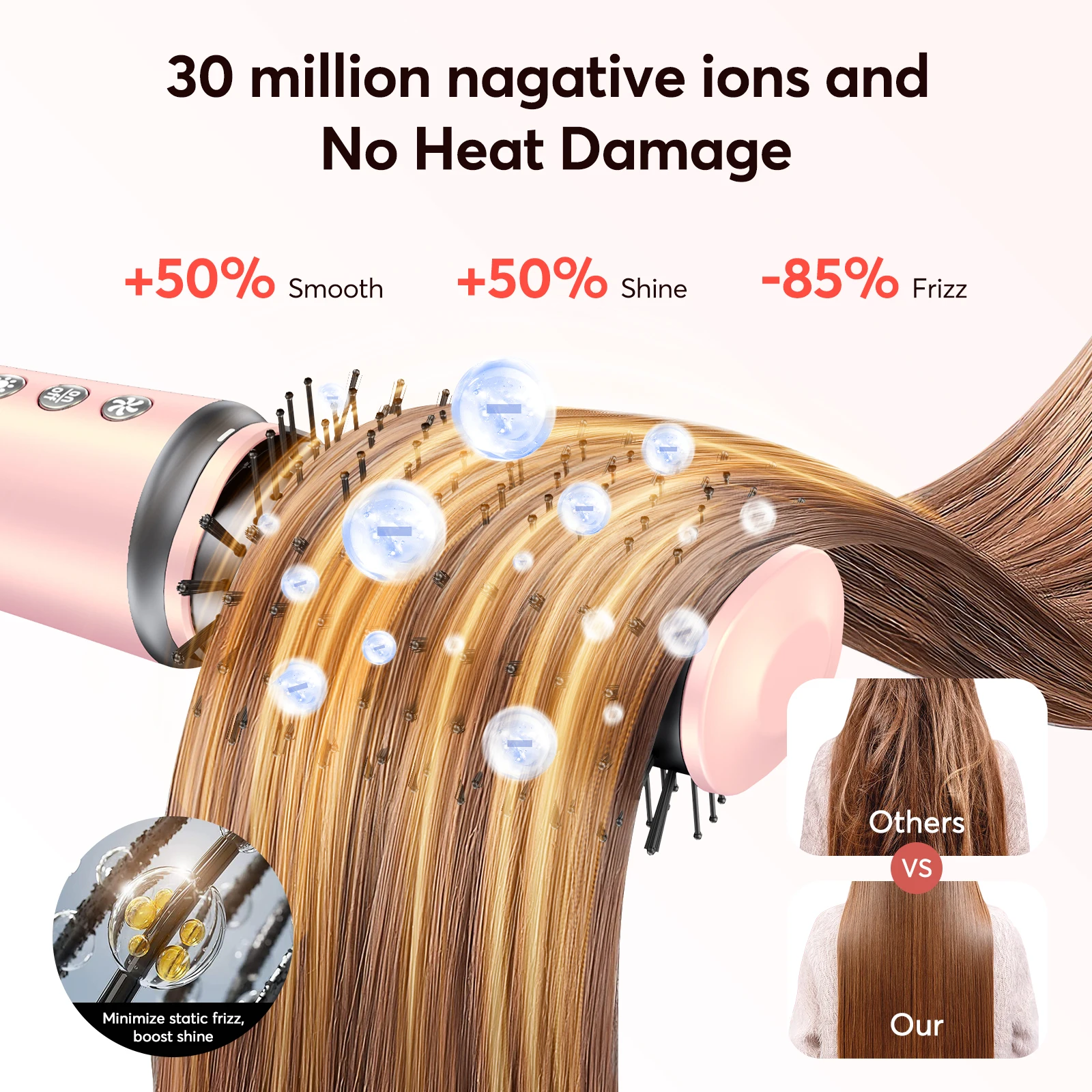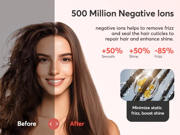 ã€Ionic Care】Hot Air Styler adopts ceramic coating technology, and the built-in device releases 320 Millionen of negative ion airflows, which can effectively smooth static frizz and increase luster. The airflow with negative ions acts on the hair, making it volumizing and smoother.