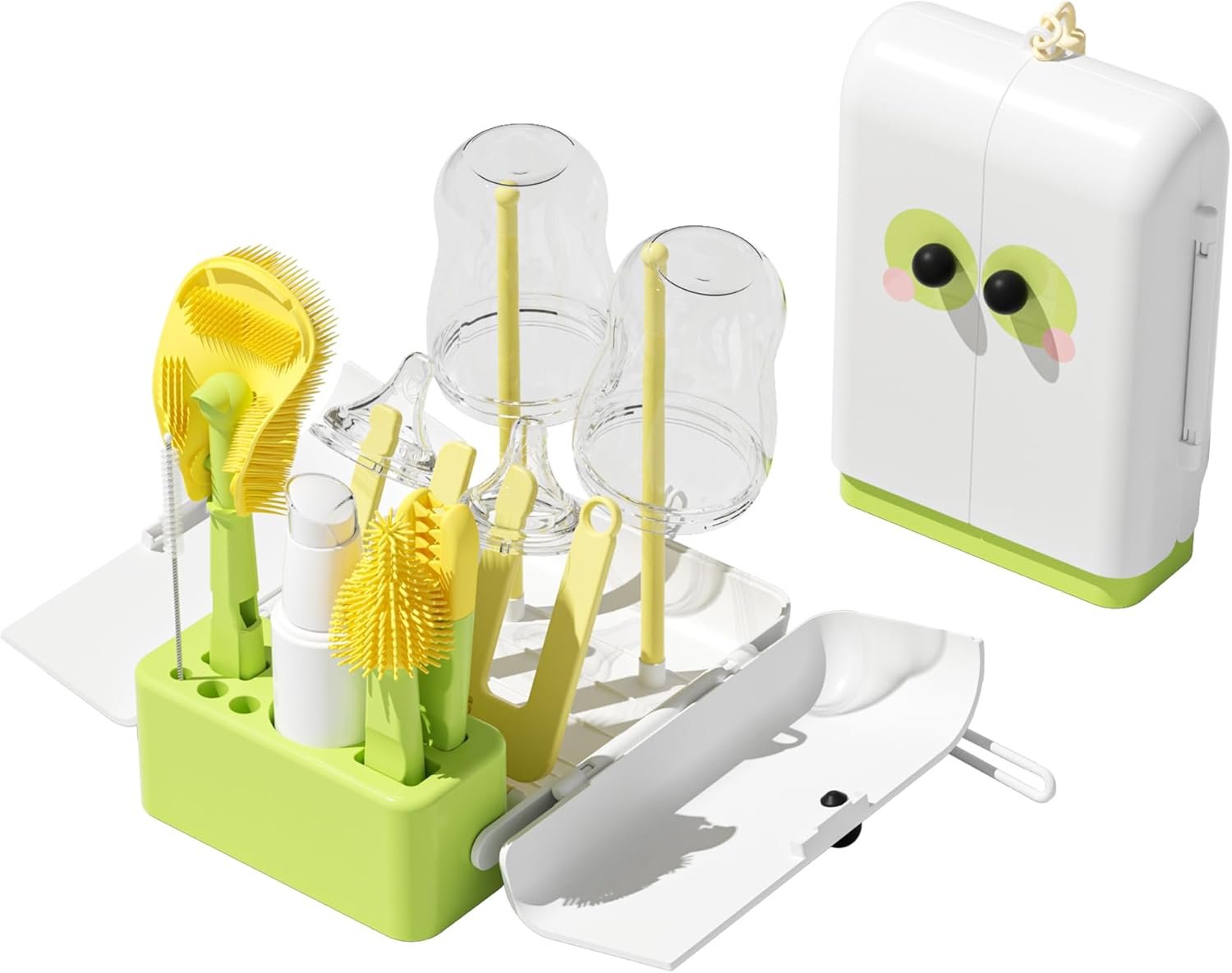 Bottle Brush Set – 7 in 1 Bbay Bottle Cleaning Kit with Silicone Bottle Brush, Nipple Brush, Straw Brush, Soap Dispenser, Drying Rack,Cup Lid Cleaning Brush, Storage Box, Baby Travel Essential-(Green)