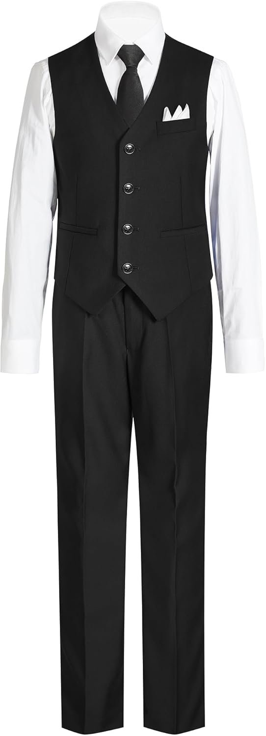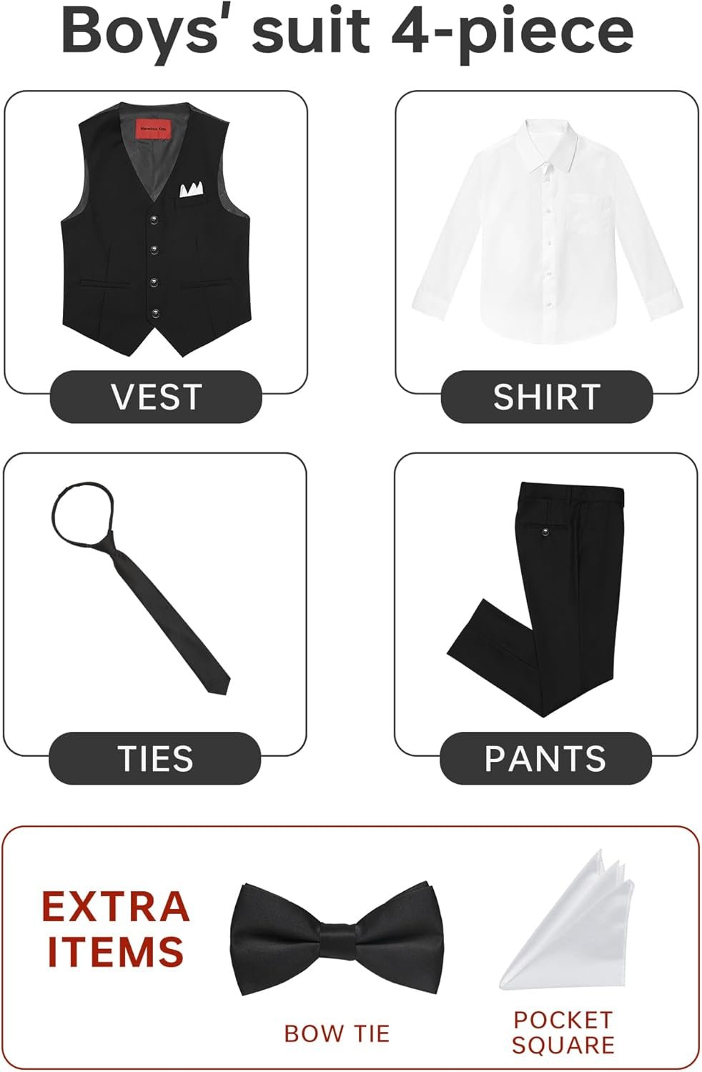 Boys’ 6-Piece Formal Slim Fit Suit Set, Vest, Pants, Dress Shirt, Tie, Pocket Square, and Bow Tie
