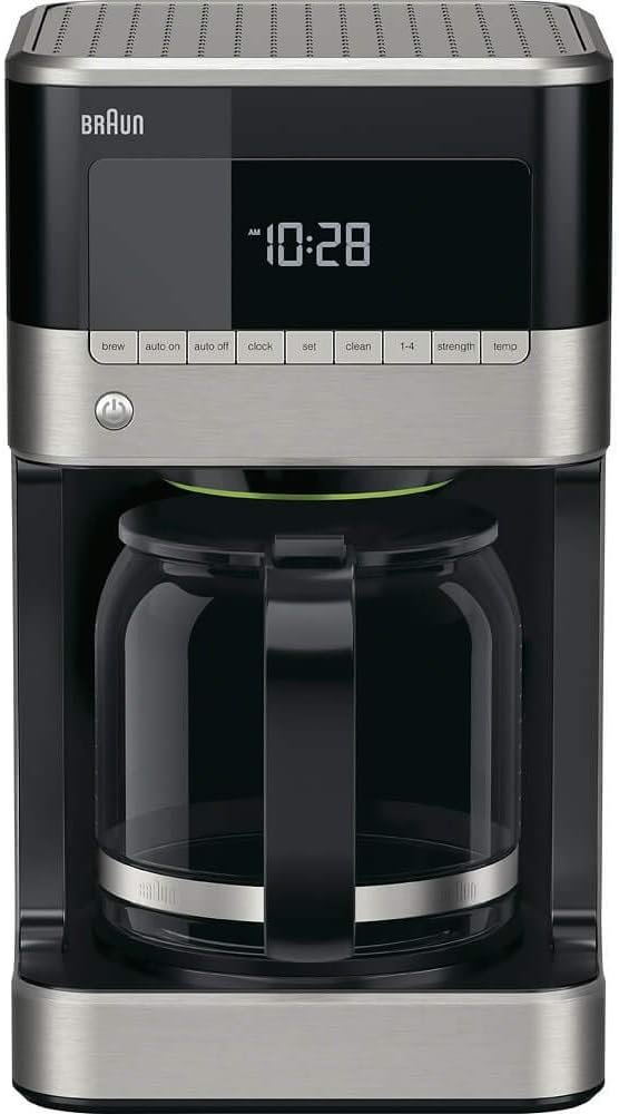 Once the aroma of fresh-brewed coffee fills the kitchen, a cup of goodness awaits with the Braun Brew Sense 12-cup Drip Coffee Maker, model KF7150. This model features a stainless steel and piano black finish with extra wide display. The Pure Flavor system brews your coffee at exactly the right temperature and brewing time to extract the best flavor and aroma.