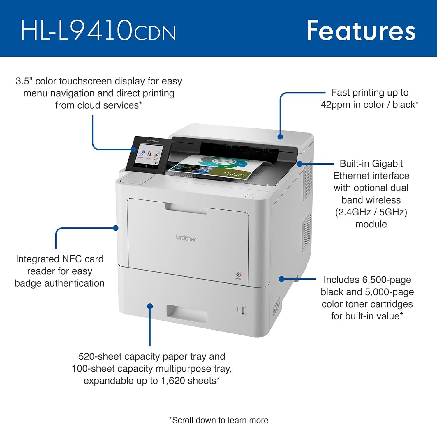 The Brother HL‐L9410CDN Enterprise Color Laser Printer is designed for how work now works – providing enterprise‐level performance, advanced security features, and reliable, high‐quality output in a compact footprint that is ideal for mid to large‐sized workgroups. This high‐ performance printer helps to increase productivity with fast print speeds up to 42ppm(1). Offers built‐in value with included Brother Genuine 6,500‐page black and 5,000‐page color toner cartridges. For even lower cost printing, use Brother Genuine TN810XL high‐yield replacement toner cartridges for 12,000 pages black and 9,000 pages color(2). Equipped with Triple Layer Security features to help safeguard your network, keep your devices secure, and protect documents in transit to and from print devices. Includes an integrated NFC card reader for easy badge authentication. Help minimize paper refills with the 520‐sheet capacity paper tray, as well as a large 100‐sheet capacity multipurpose tray for printing custom media(3). Flexible paper handling includes the ability to expand to up to 1,620 sheets total capacity with optional trays(4). User friendly design ensures easy replacement of paper and toner. 3.5” color touchscreen display allows for seamless menu navigation and the ability to print from popular business cloud services(5). Offers flexible connectivity with Gigabit Ethernet networking and the availability of an optional dual band (2.4GHz / 5GHz) wireless module (NC‐9000W), plus convenient mobile device printing to meet mobile workforce demands(2). ENERGY STAR® certified and EPEAT® Silver rated. Reduce paper costs with default duplex printing. Eco Mode helps to reduce power consumption, while Toner Save Mode helps to reduce toner use. Includes one‐year standard limited warranty and the opportunity for a multi‐year limited warranty extension, as well as free online, live chat, or phone technical assistance for the life of your product. 1 Based on one‐sided printing. Change from default setting required. 2 Approximate toner cartridge yield in accordance with ISO/IEC 19798 (letter/A4). 3 Maximum capacity based on using 20 lb. paper. 4 Requires additional purchase. 5 Requires an Internet connection and an account with desired service. 5 Requires connection to a wireless network.