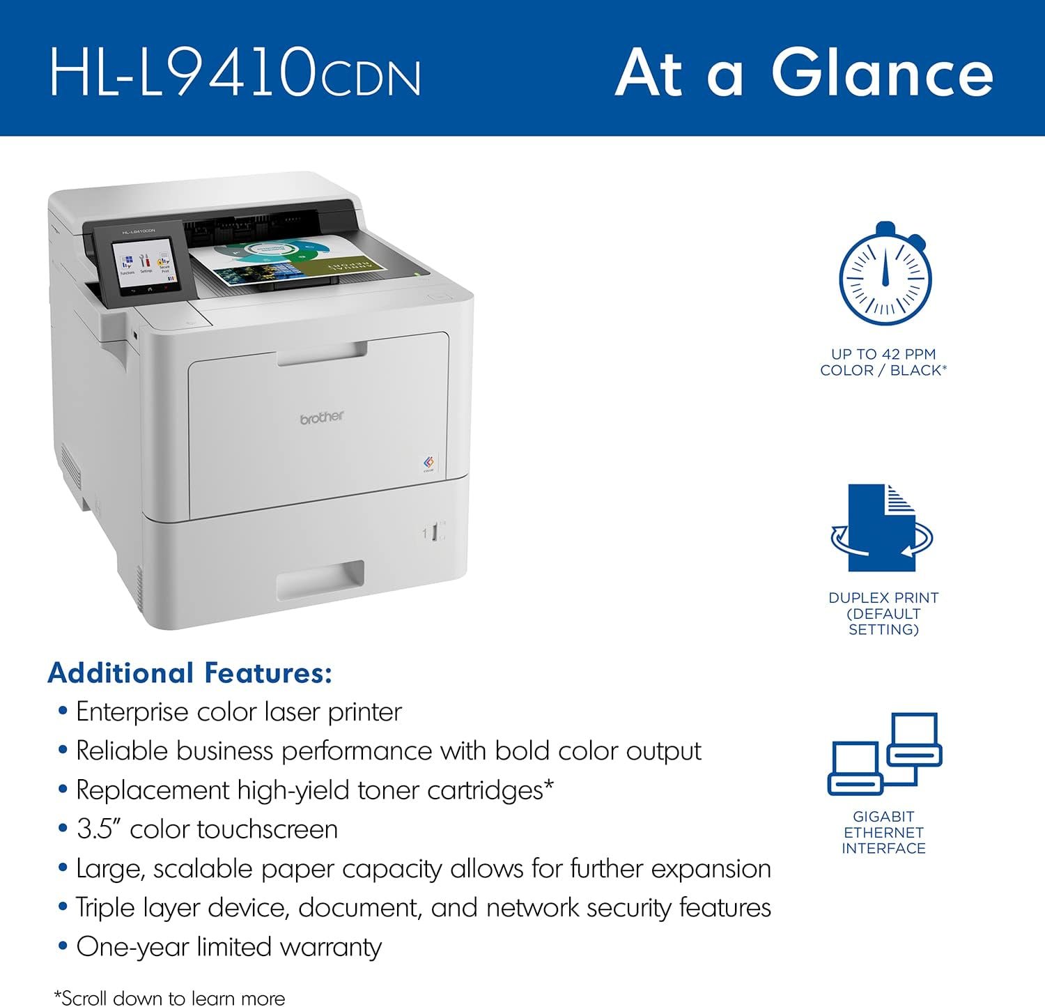 FAST BUSINESS COLOR PRINTING: The Brother HL‐L9410CDN Enterprise Color Laser Printer provides the fastest color laser print speeds ever from Brother – up to 42ppm(1) to help increase workgroup productivity.