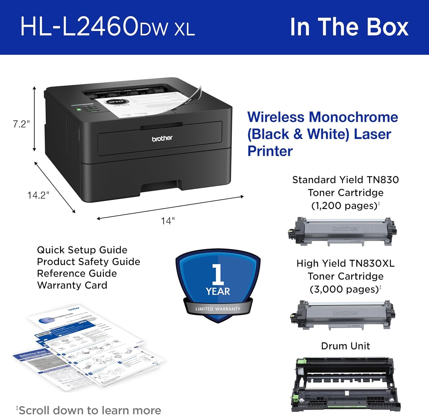 The Brother HL-L2460DW XL Wireless Compact Monochrome (Black & White) Laser Printer is the affordable choice for high-quality, high-volume printing. This reliable small business printer features six times more toner in-box(3) than the HL-L2640DW, for up to 4,200 consistently crisp pages.(1) Engineered for exceptional efficiency, this reliable home office printer consistently produces crisp, easy-to-read black & white prints at speeds up to 36 pages per minute(2) (ppm). Its compact footprint means you can place this small printer in a convenient location on your desktop. Meanwhile, you can connect it to your devices through a range of flexible connection options, such as dual-band wireless, Ethernet, and USB 2.0. Best of all, you can print to your Brother printer from virtually anywhere with the Brother Mobile Connect App.(4) Designed with productivity and sustainability in mind, featuring a convenient 250-sheet paper tray,(5) which reduces the frequency of paper refills; automatic duplex printing, which saves time and reduces paper waste; and Toner Save Mode, which extends the life of your toner cartridge. Plus, this b/w laser printer is also ENERGY STAR® compliant and EPEAT® Silver rated. To help safeguard your information and maintain secure connections while printing, the HL-L2640DW XL includes a host of advanced security features. Use with Brother Genuine Supplies, expertly engineered by Brother to produce reliably sharp and smudge-free black & white prints in your Brother laser printer: Replacement Toner TN830 (Standard), TN830XL (High Yield), and TN830XL 2PK (Twin-Pack); and Replacement Drum Unit DR830. Disclaimers 1. Approximate toner cartridge yields in accordance with ISO/IEC 19752 (Letter/A4). 2. Based on one-sided printing. Change from default setting required. 3. Based on using the included cartridges (Standard-yield (1,200 pages) and High-yield (3,000 pages)) with HL-L2460DW XL vs. starter cartridge included with model HL-L2460DW (700 pages). Page yields are approximate and are in accordance with ISO/IEC 19752 (Letter/A4). 4. Free app download and wireless connection required. Compatibility may vary by device and operating system. 5. Maximum capacity based on using 20-lb. paper. 6. Based on monthly subscription cost in U.S. for Mono Laser Power Plan vs. average cost per page of eligible like standard capacity cartridges. Savings will vary based on Refresh EZ Print Subscription plan selected. 7. Refresh Free Trial requires enrollment in a monthly billed Brother Refresh EZ Print Subscription service plan based on monthly printed page allotments. Unused pages roll over, limitations apply. Additional page set charges and taxes apply during trial. Plan, options offer, and pricing subject to change. Open to new subscribers located in the contiguous United States only. After the free trial period your credit card will be charged on a monthly basis for the Plan Fee, Overages, and Taxes in accordance with the Terms of Service. Overage fees will apply during free trial. Your service will continue on a month-to-month basis until you cancel it. May be canceled at any time. If your printer did not include a Refresh ready cartridge at purchase, upon cancellation, the subscription cartridge you received will be deactivated and must be replaced with a standard cartridge at your expense in order to continue printing. ENERGY STAR and the ENERGY STAR mark are registered trademarks owned by the U.S. Environmental Protection Agency. EPEAT is a trademark of the Green Electronics Council in the United States and other countries. Images are for illustrative purposes only. Specifications subject to change.