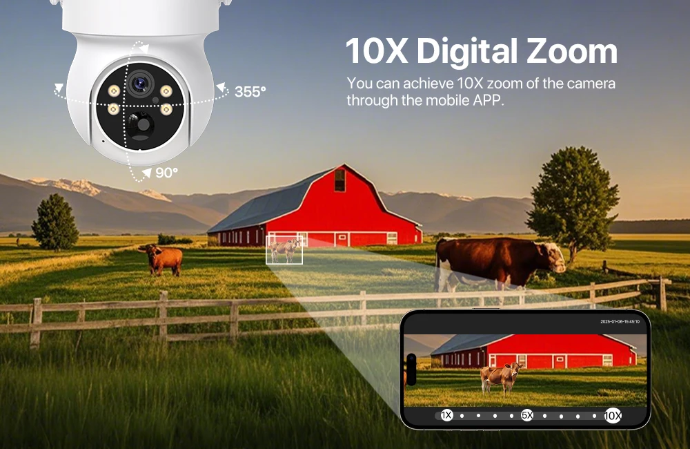 The PTZ security camera has a panning function and can rotate 355° horizontally at high speed. The 90° tilt rotation can achieve reliable home and business monitoring without vertical limitation and “dead zones”.
