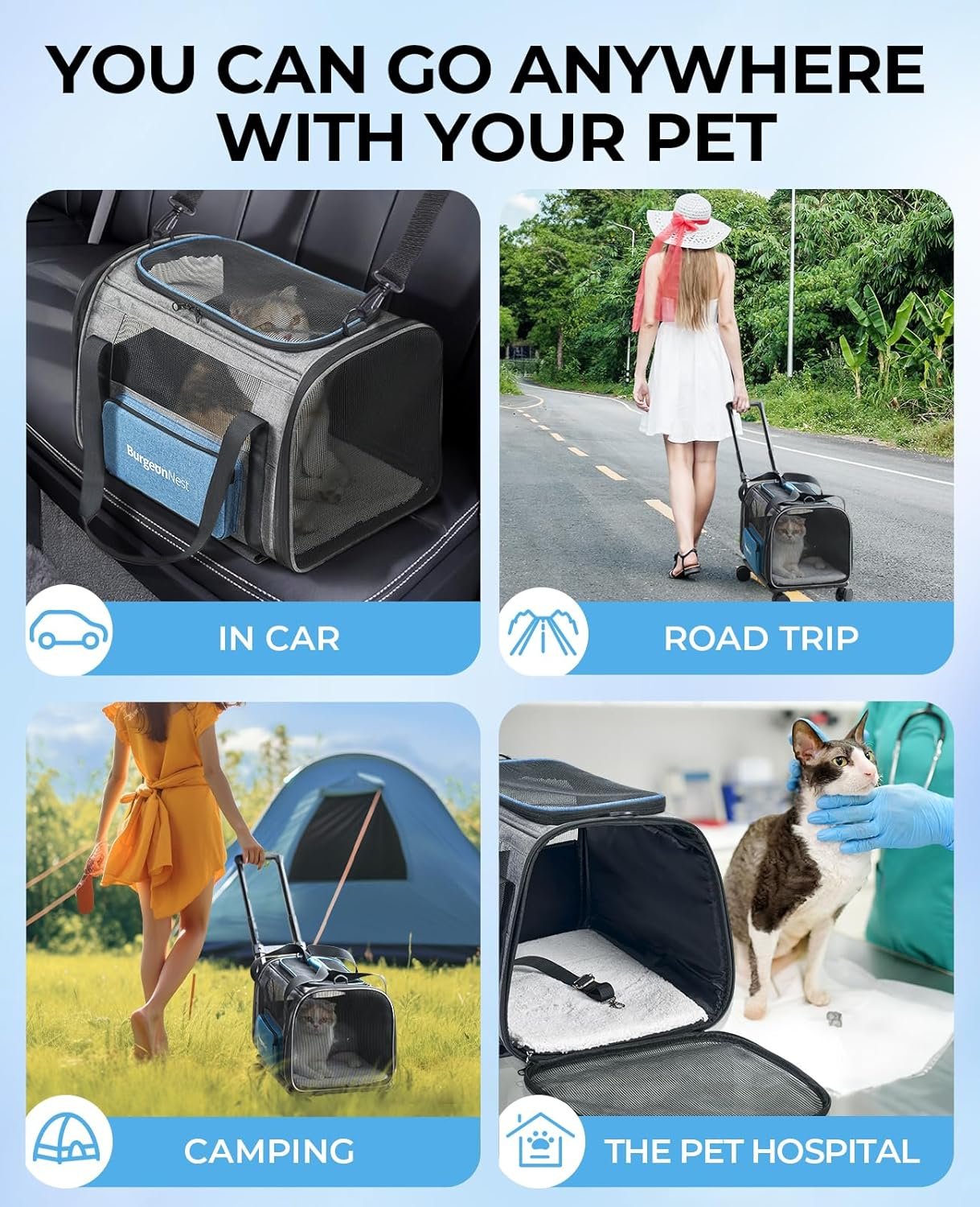 Swivel Easily & Wheels Do Not Fail: The BurgeonNest rolling pet carrier has a removable platform with two 360° silent swivel front wheels, and two fixed rear wheels for added stability. This structure ensures your pet experiences a smooth and safety journey.