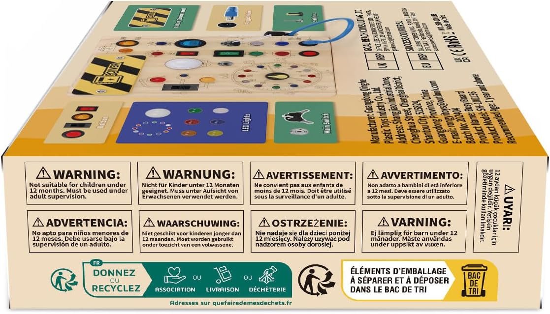 Elaborate Design – This busy board is made especially for young children who like playing with switches and LED lights. On this busy board, there are 10 separate switches, and each switch relates to a different color or style of LED light. Each LED’s brightness is set to be just right for the infant-not too bright, blinding, or dark to see well.A master switch is set up to turn off all LED lights with one click to avoid wasting power.