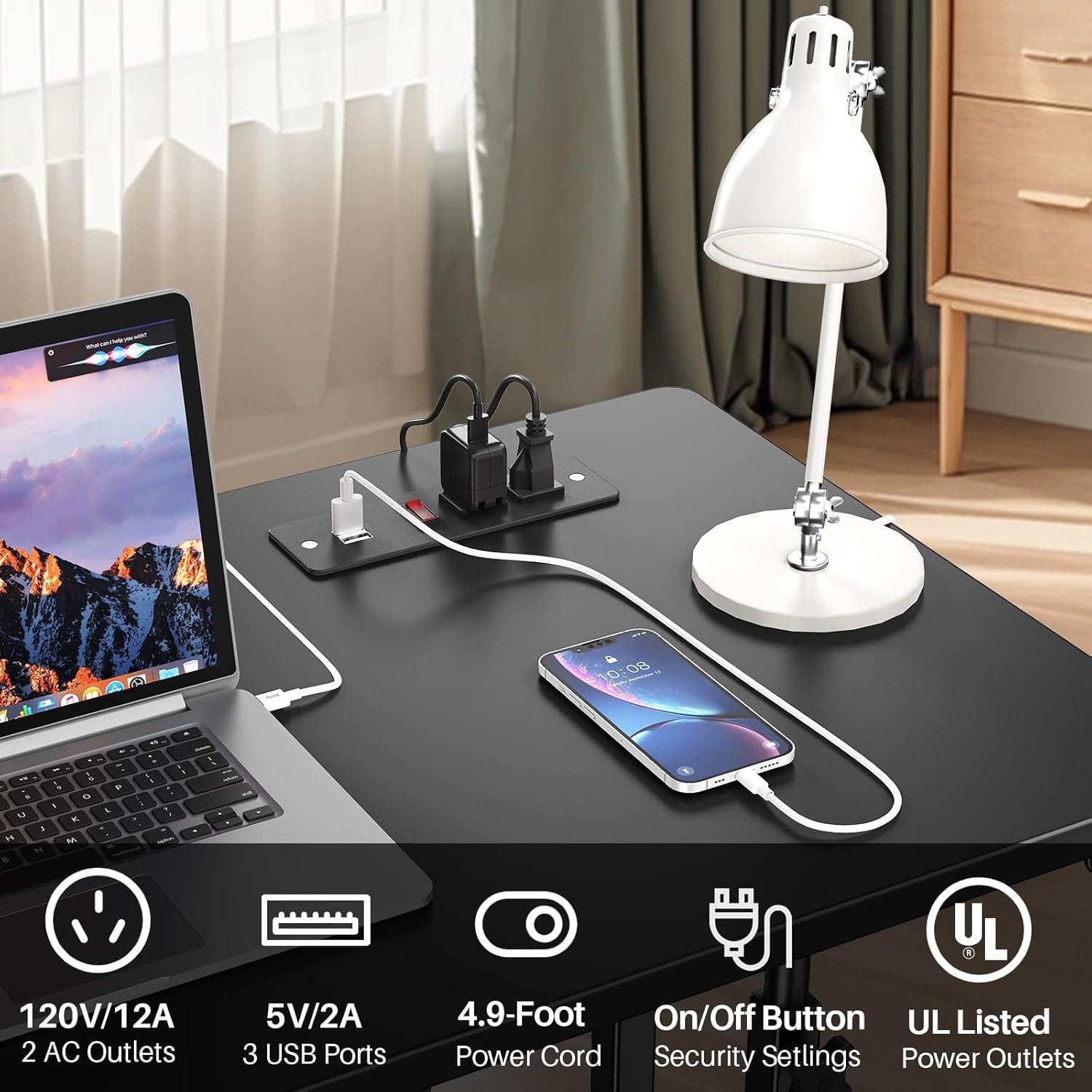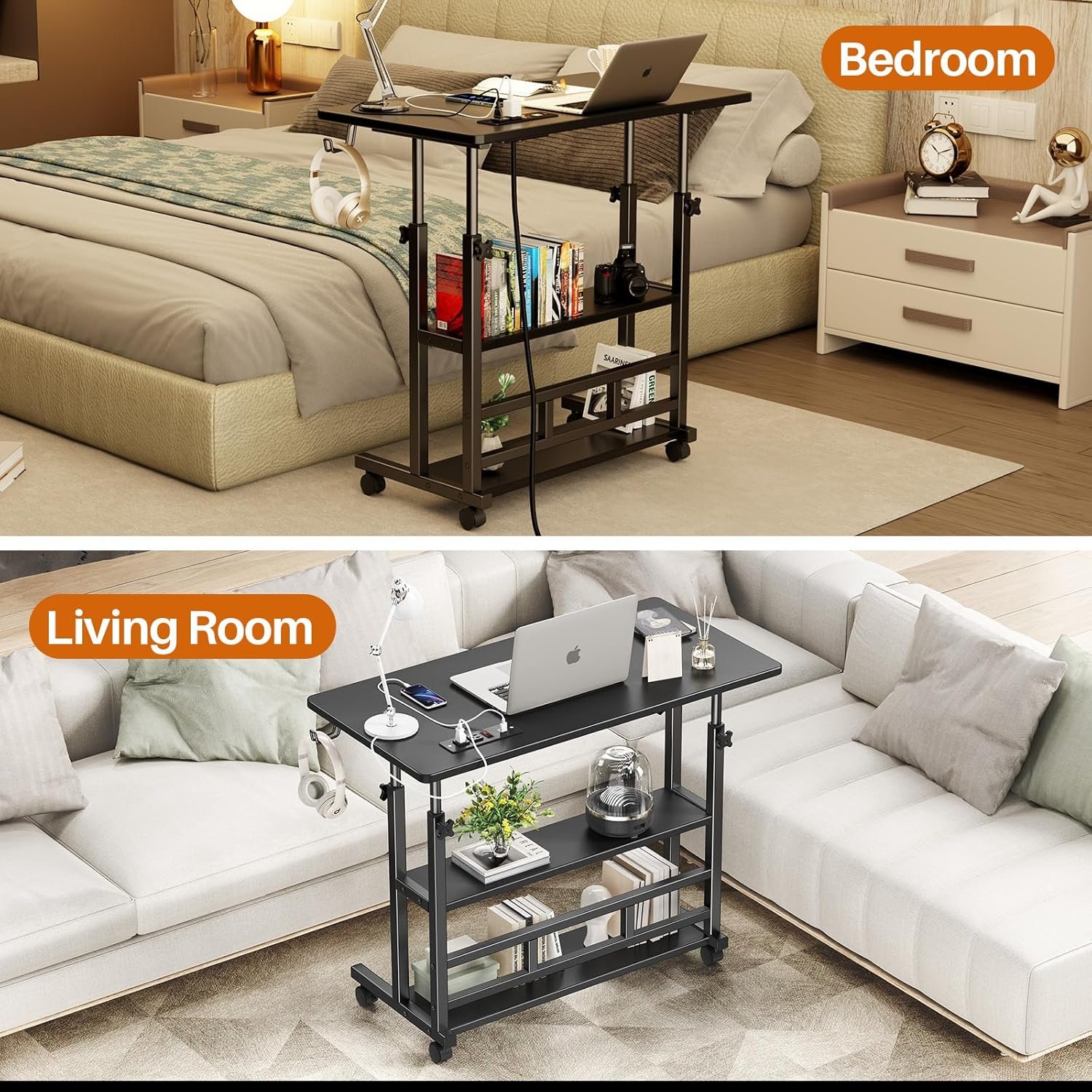Mobile Standing Desk with Power Outlets: Equipped with 2 power outlets with switch and 2 USB ports, as well as a 4.9-foot power cord, this rolling standing desk makes it easy to charge electronic devices such as your cell phone, laptop, gaming device, or Bluetooth device. Make use more convenient whether at work or play