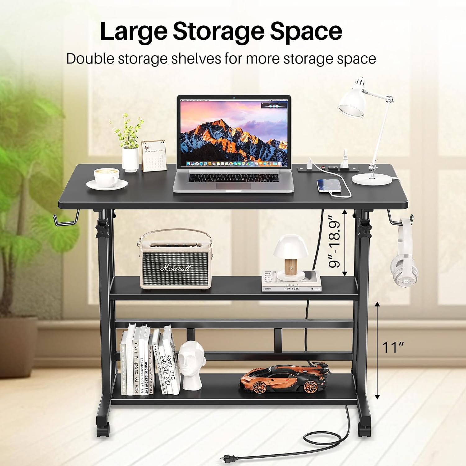 BYMECOST Adjustable Height Standing Desk with Power Outlets, Rolling Stand Up Desk with Storage Shelves, 31.5″ Small Mobile Computer Desk, Portable Laptop Table (Black)