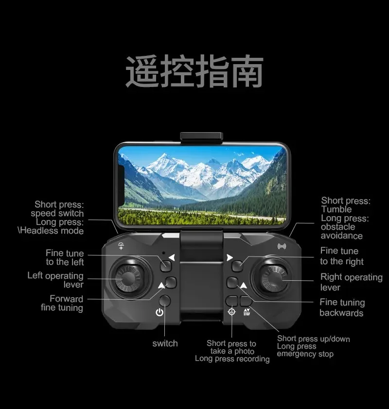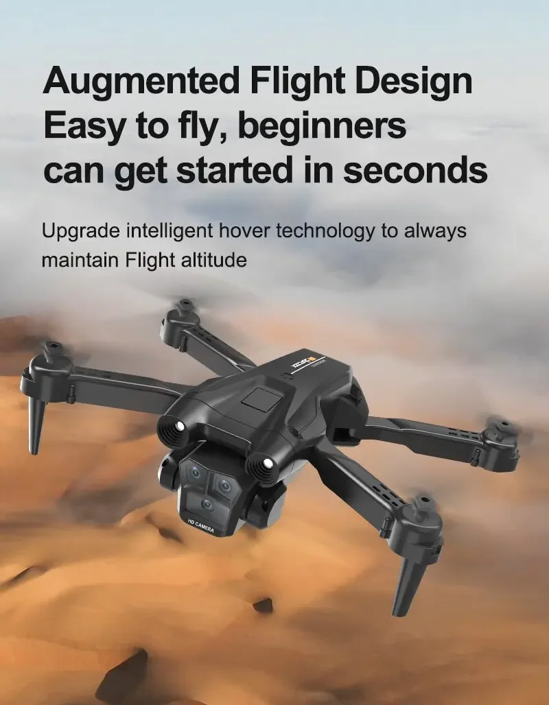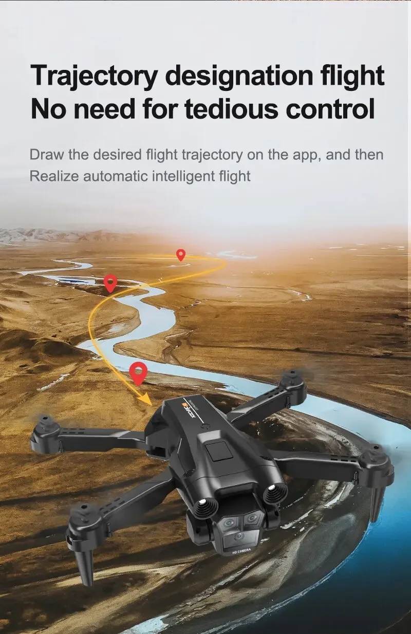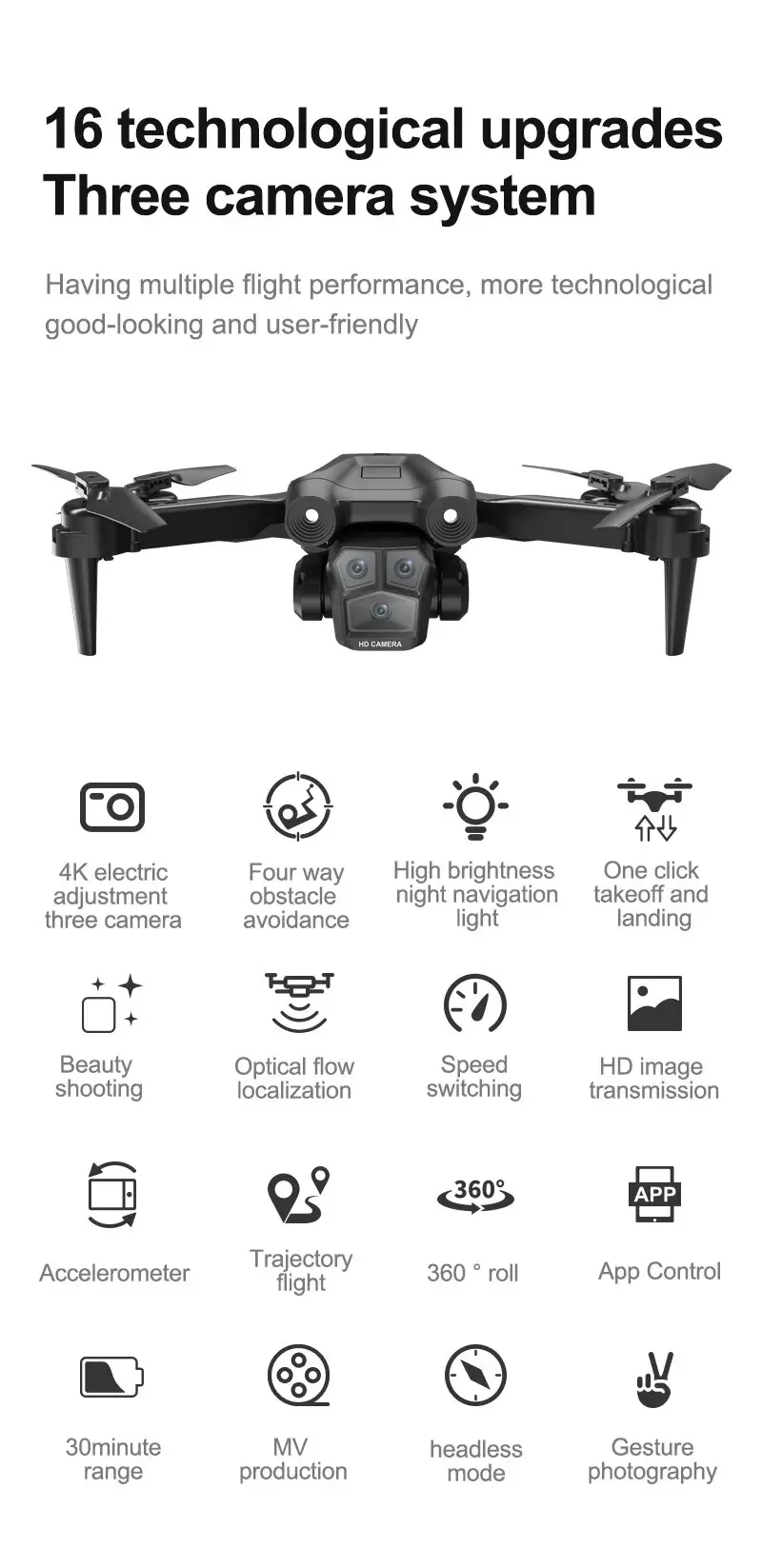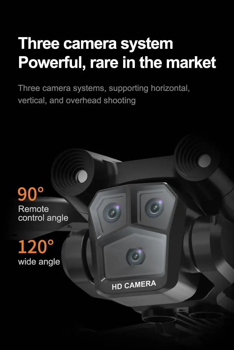 Product features: Three 8K HD cameras can be electrically adjusted to shoot vertically and horizontally. Light flow positioning hover, intelligent following, night lighting, speed switching, HD image transmission, gravity sensing, trajectory flight, 360° roll, APP control, headless mode, gesture photography. One-touch takeoff, ascent, descent