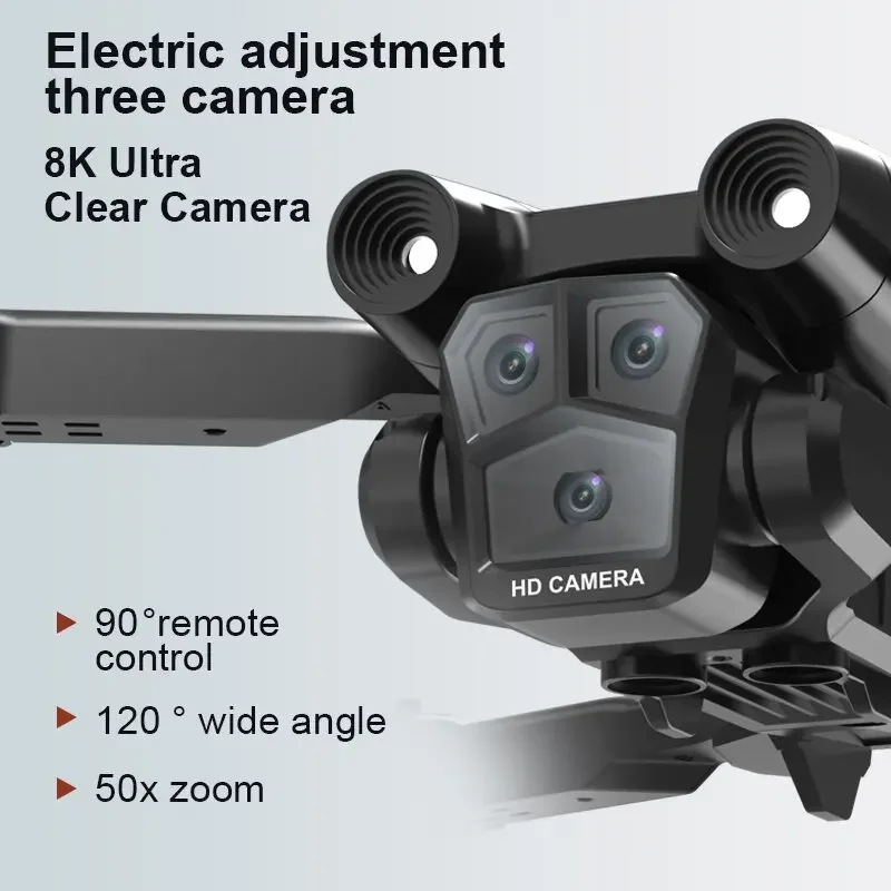 Product features: Three 8K HD cameras can be electrically adjusted to shoot vertically and horizontally. Light flow positioning hover, intelligent following, night lighting, speed switching, HD image transmission, gravity sensing, trajectory flight, 360° roll, APP control, headless mode, gesture photography. One-touch takeoff, ascent, descent