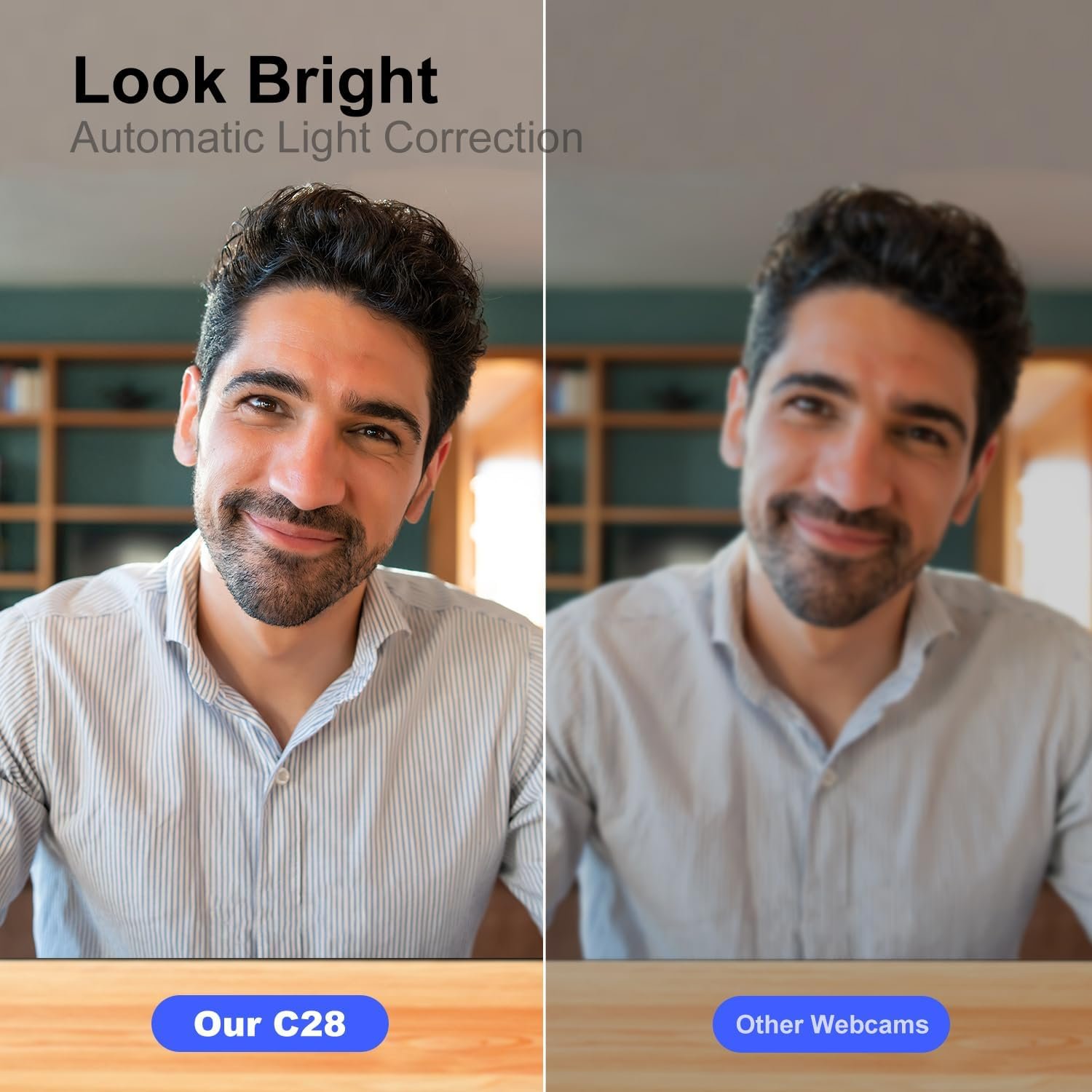【Automatic low-light correction technology 】C28 web camera also has low-light boost, color boost and adjust exposure so you look your best, even in dim and harsh lighting
