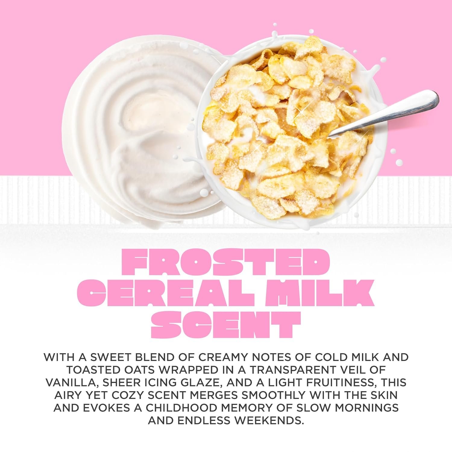 FROSTED CEREAL MILK SCENT: With a sweet blend of creamy notes of cold milk and toasted oats wrapped in a transparent veil of vanilla, sheer icing glaze, and a light fruitiness, this airy yet cozy scent merges smoothly with the skin and evokes a childhood memory of slow mornings and endless weekends. Top Notes: powdered sugar, lemon zest | Middle notes: fresh strawberries, cold oatmilk | Bottom Notes: vanilla extract, frosted cereal.