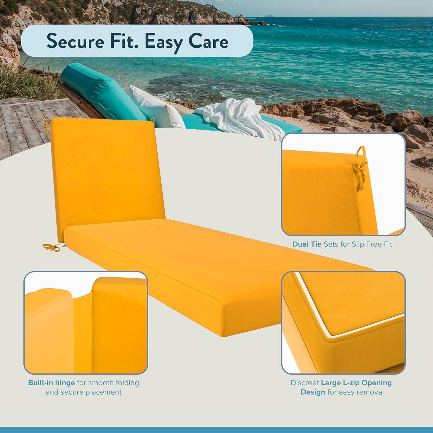 Designed with a discreet L-shaped zipper for easy removal, the washable cover can be air-dried to keep your space feeling fresh and breezy. Four-corner fabric ties keep the cushion securely in place for lasting comfort and stability, while a built-in hinge ensures the cushion stays aligned and comfortable—whether upright or fully reclined.