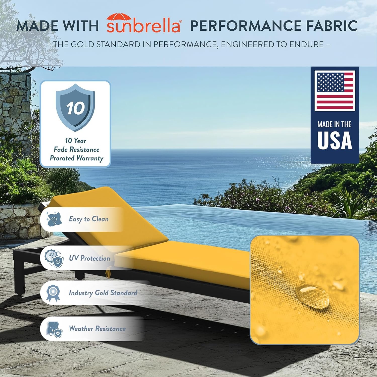 Made for life by the water, the cushion cover is wrapped in premium Sunbrella fabric – engineered to withstand sun, salt, and everyday outdoor living. Its superior fade resistance keeps colors vibrant season after season, backed by a 10-year prorated warranty for lasting peace of mind.