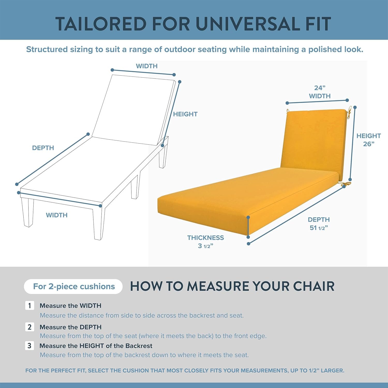 Spacious 24″ x 78″ x 3.5” chaise lounge cushion with a long, rectangular shape designed to fit most standard chaise lounge furniture.
