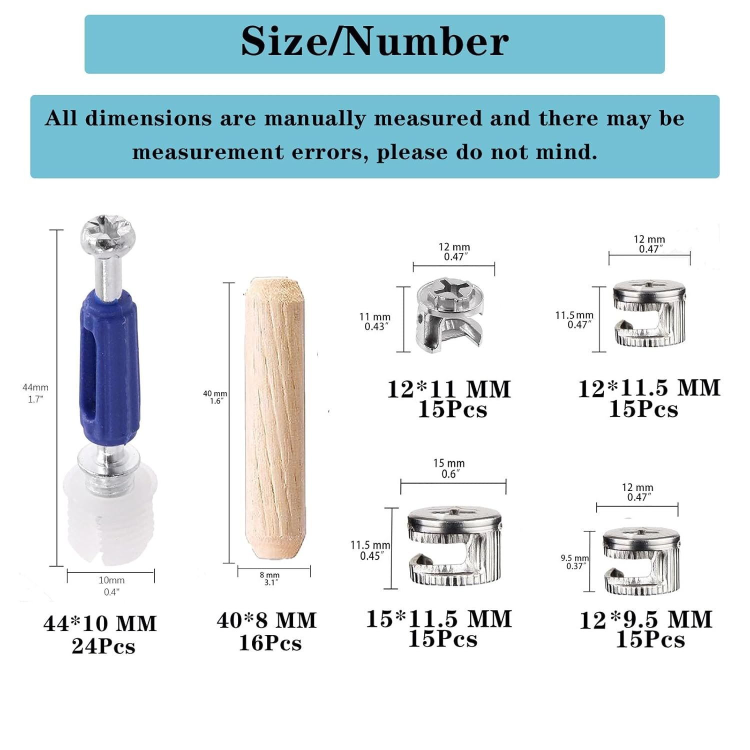 【3-in-1 Cam Locks for Furniture】Our complete furniture fasteners set includes: 24 pcs cam lock screw (M6x40mm); 24pcs plastic expansion nuts (M10x9mm);60 pcs cam nuts (15pcs 12x11mm, 15pcs12x12mm, 15pcs 15×11.5mm, 15pcs 12×9.5mm);16pcs wooden dowel(M8x40mm) , totally 124pcs. All these are packed in a transparent box for easy storage and carrying.Enough accessories and different sizes will fits for most drawer dresser or cabinet