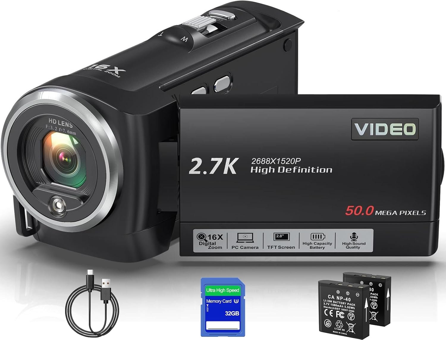 2.7K & 50MP Video Camera: The camcorder produces video at QHD 2.7K resolution and 50MP photos. It features a 2.8-inch/270-degree rotating screen and 16x digital zoom. The video recorder camcorder comes with a 32GB high-speed memory card specifically designed for cameras, with support for expansion up to 128GB. This vlog camera is the perfect companion for exploring this beautiful world! Great for traveling, meetings, studying, and capturing lovely moments.