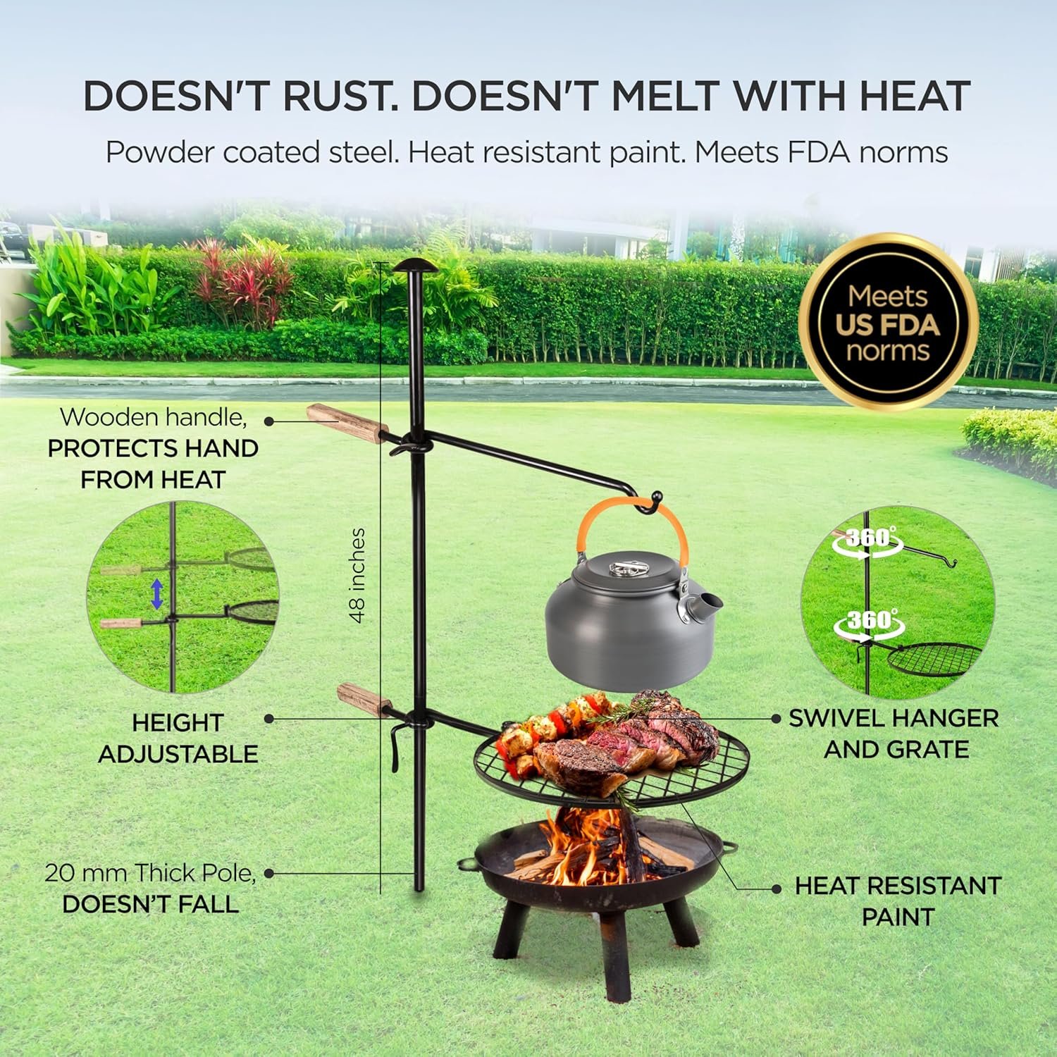 DOESN’T RUST. DOESN’T MELT WITH HEAT. Made of powder coated steel and doesn’t rust. Painted with heat resistant paint. Meets stringent FDA NORMS. Wooden handles to protect hand from heat. A perfect open fire cooking equipment
