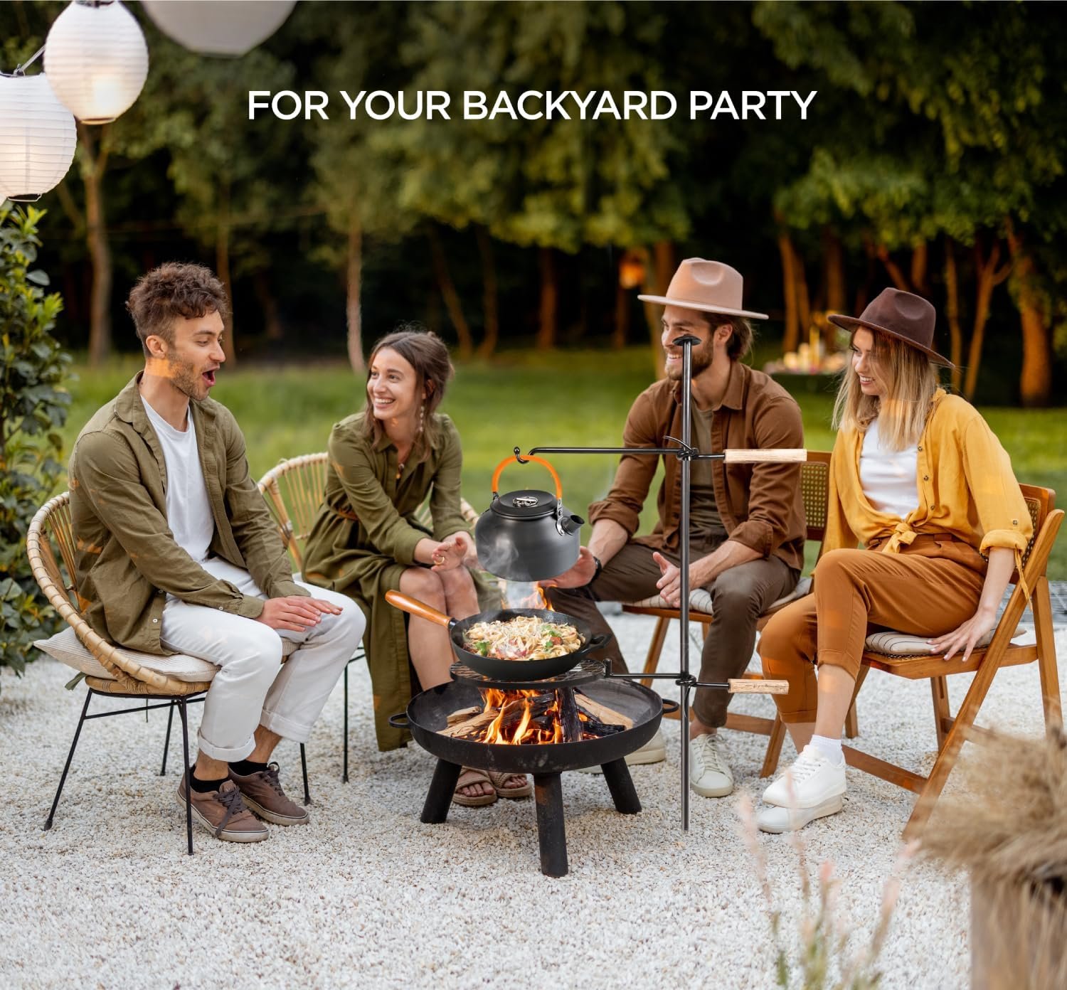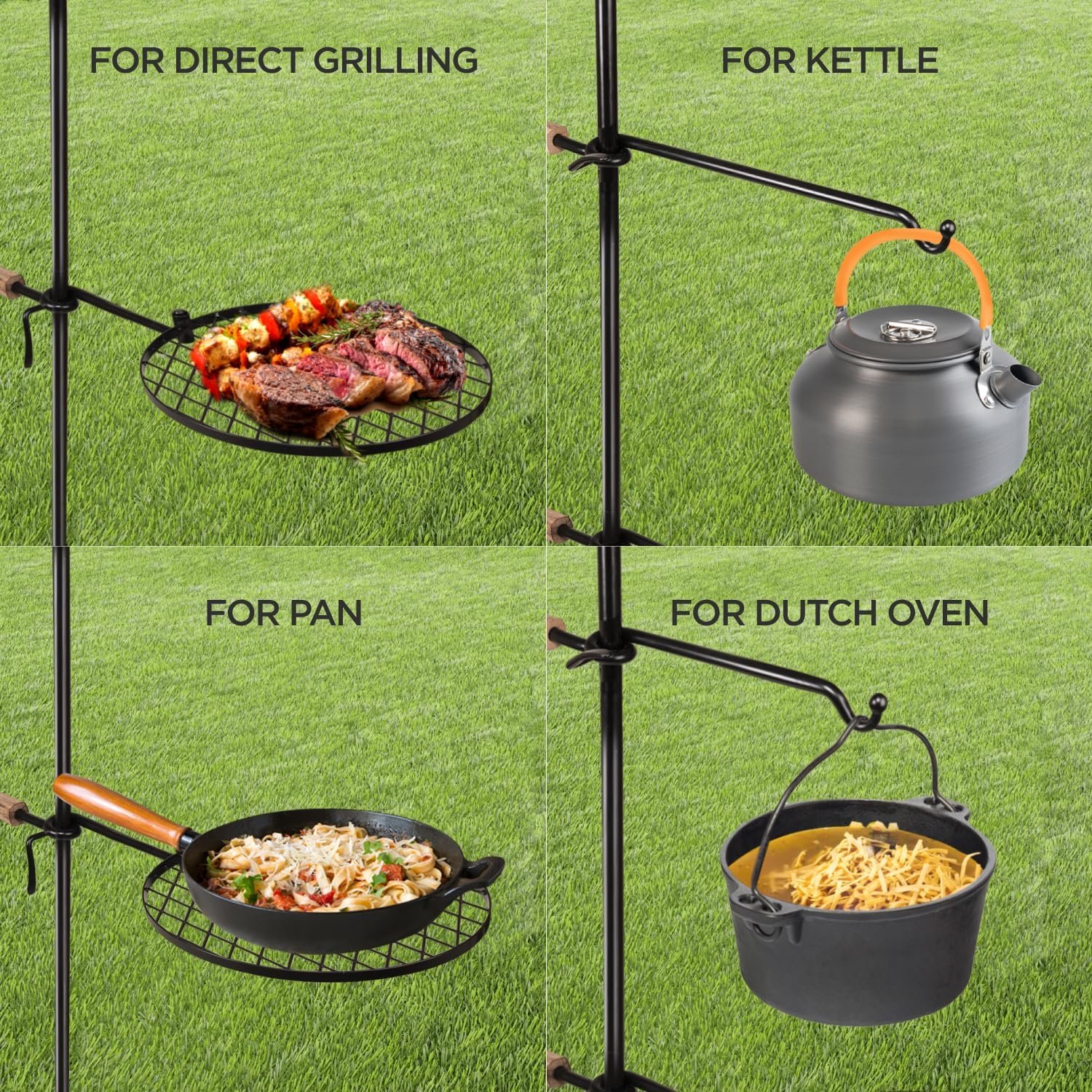 FOR DIRECT GRILLING, KETTLE, PAN and DUTCH OVEN. Comes with 13.4 inch swivel campfire grill grate ring to grill directly or to hold pans. Hanger rod to hang kettle or dutch oven