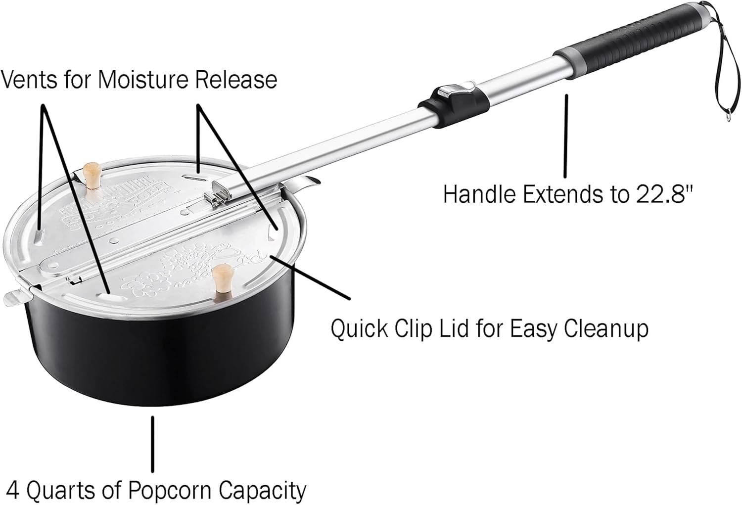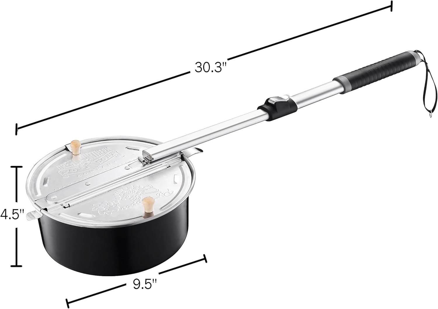 PRODUCT DETAILS – Materials: Metal and Plastic. Dimensions: (L) 30.3″ x (W) 9.5″ x (H) 4.5″. Popcorn Pot Handle Extends to 22.8”. Color: Black.
