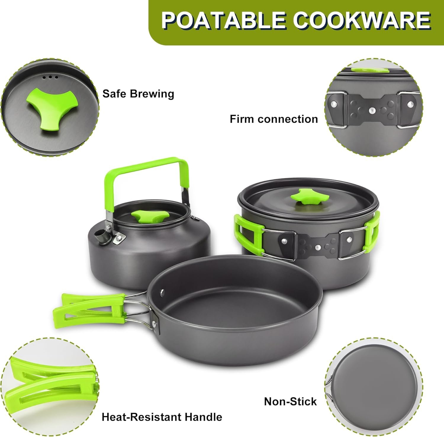 Healthy Material Cookware – The camping cooking set is made of high-quality anodized aluminum and food-grade silicone material that is non-toxic, lightweight, high temperature resistant, easy to clean and quick heat transfer to save time and fuel